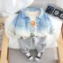 -Geacă din denim de înaltă calitate și moale de culoare albastră. Model cu efect de batik modern pentru sezon. Adăugată guler clasic, două buzunare, imprimeu cu text și închidere completă pe față cu butoane vizibile.
