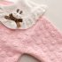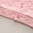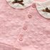 -Jachetă/hanorac tip bomber, realizată din material de înaltă calitate, cu model în relief cu iepurași mici, în nuanță roz. Model cu guler tip „Peter Pan“, decorat cu volănașe + elemente 3D. Se închide cu nasturi pentru îmbrăcare ușoară.