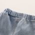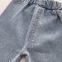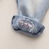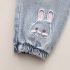 -Pantaloni din denim comozi, cu elastic în talie și la glezne pentru confort, decorați cu zone decolorate + două broderii cu iepurași pe craci.