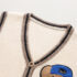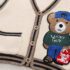 -Vestă moale, tricotată, în culoarea ecru, cu margini colorate distincte. Decolteu în V și închidere cu nasturi + buzunar suplimentar aplicat și o mare emblemă din pluș, reprezentând un ursuleț.
