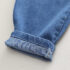 – Pantaloni din denim moale, cu croială dreaptă, talie elastică pentru confort, buzunare funcționale și o broderie simpatică cu ursuleț.