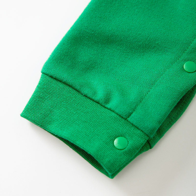 -Un combinezon moale din bumbac, cu nasturi decorativi, un buzunar și un guler efectuos. Închidere cu butoane la umăr și în partea de jos pentru o îmbrăcare rapidă și confortabilă.