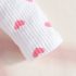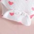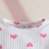– Body cu mânecă lungă, de culoare albă, confecționat dintr-un material moale și elastic, cu un efect fin de dungi (rips). Designul este decorat cu mici inimioare în nuanță roz, iar un umăr este prevăzut cu o volănașă delicată pentru un aspect mai modern și elegant.