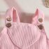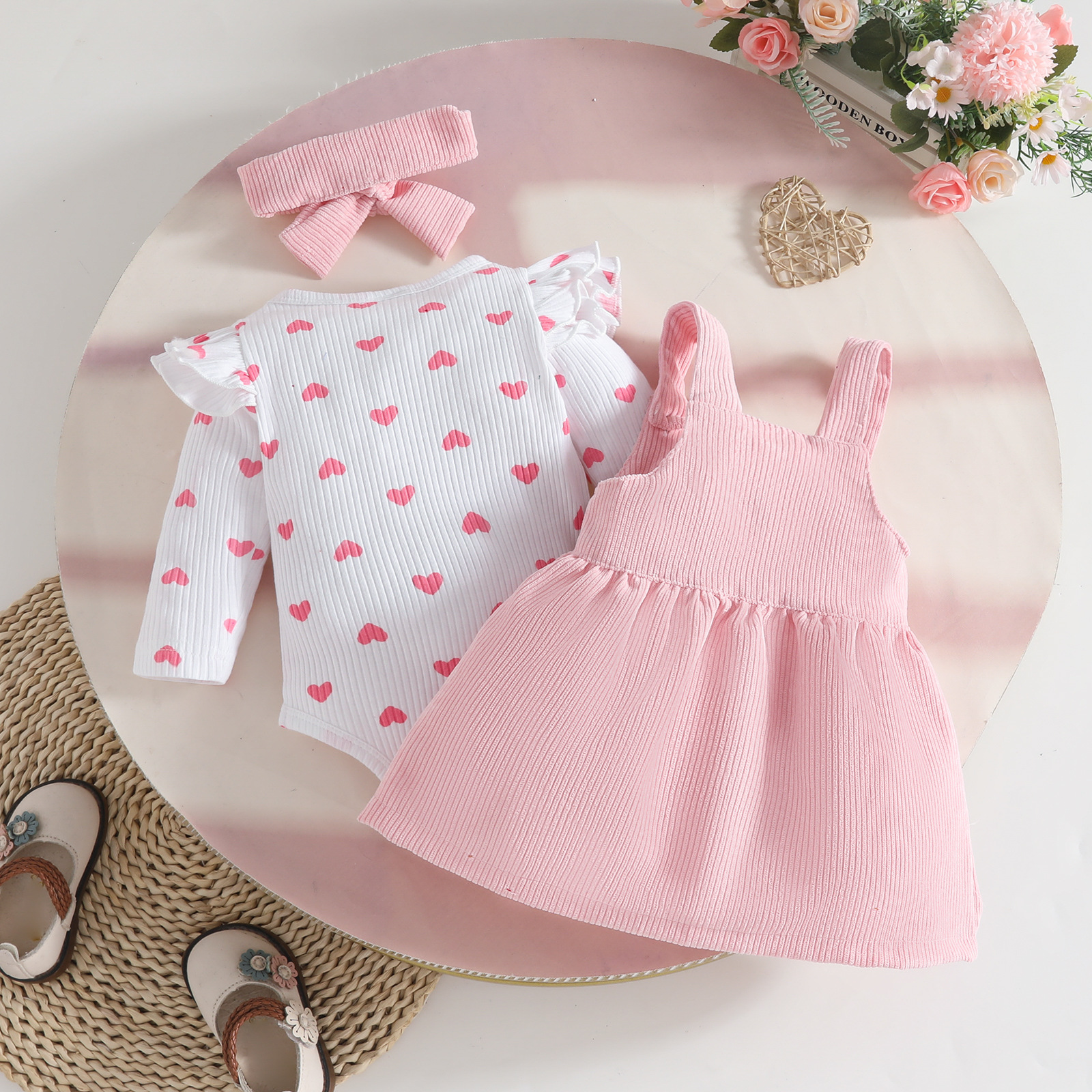 Set de 3 piese cu body din rib cu volănașe, sarafan din denim și bentiță Pink Heart