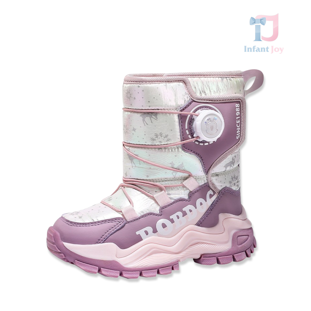 💜 Partea superioară este confecționată dintr-un material impermeabil, cu un imprimeu delicat de zăpadă și reni, evidențiat în nuanțe de mov deschis și roz pastelat.