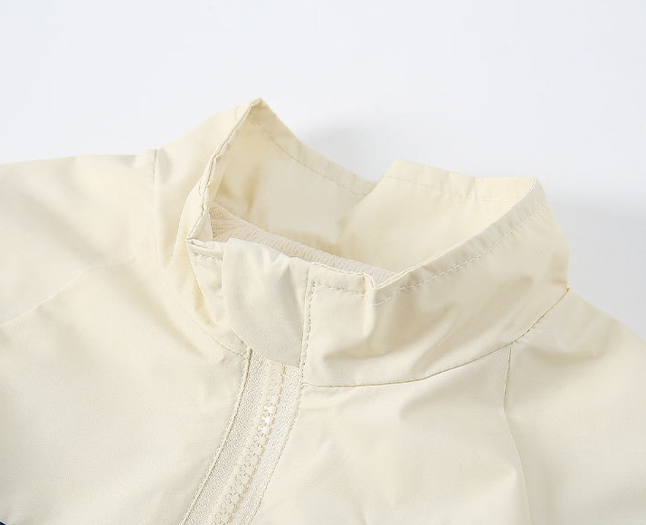 – Exterior rezistent la apă și vânt, confecționat din material tip windbreaker în nuanțe crem și verde măsliniu.