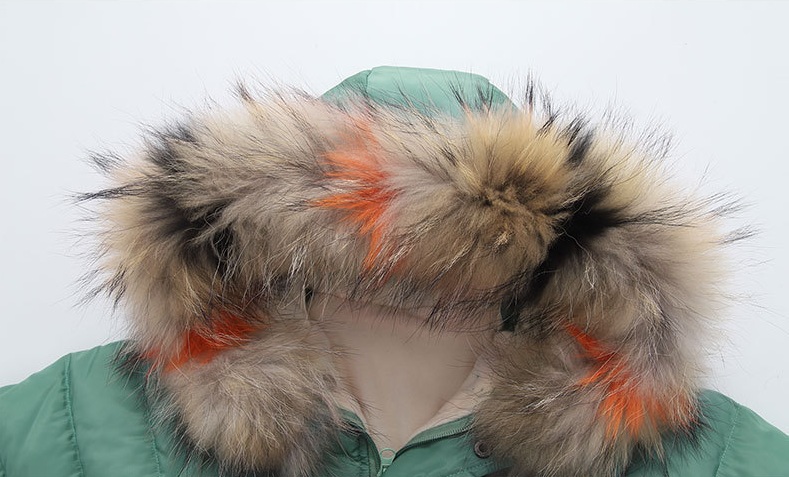 🌨️ Model într-o nuanță verde fresh, cu glugă voluminoasă decorată cu blană naturală bogată, cu accente colorate elegante.