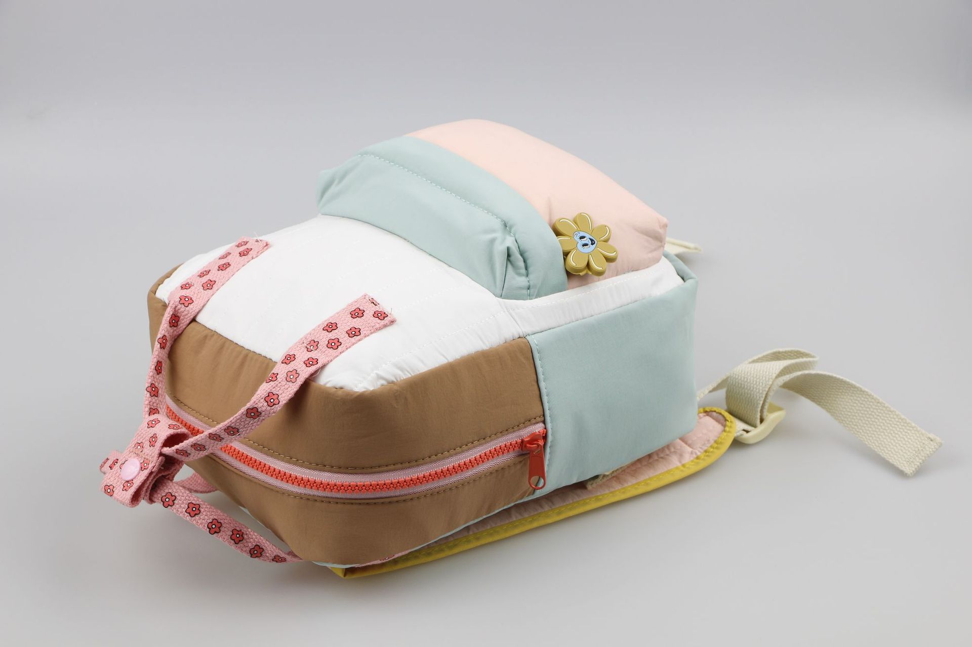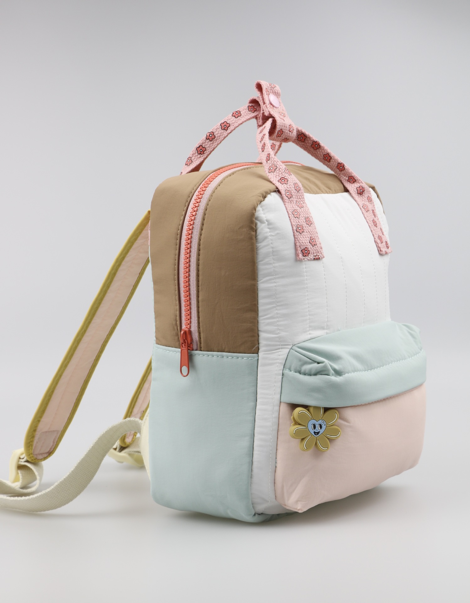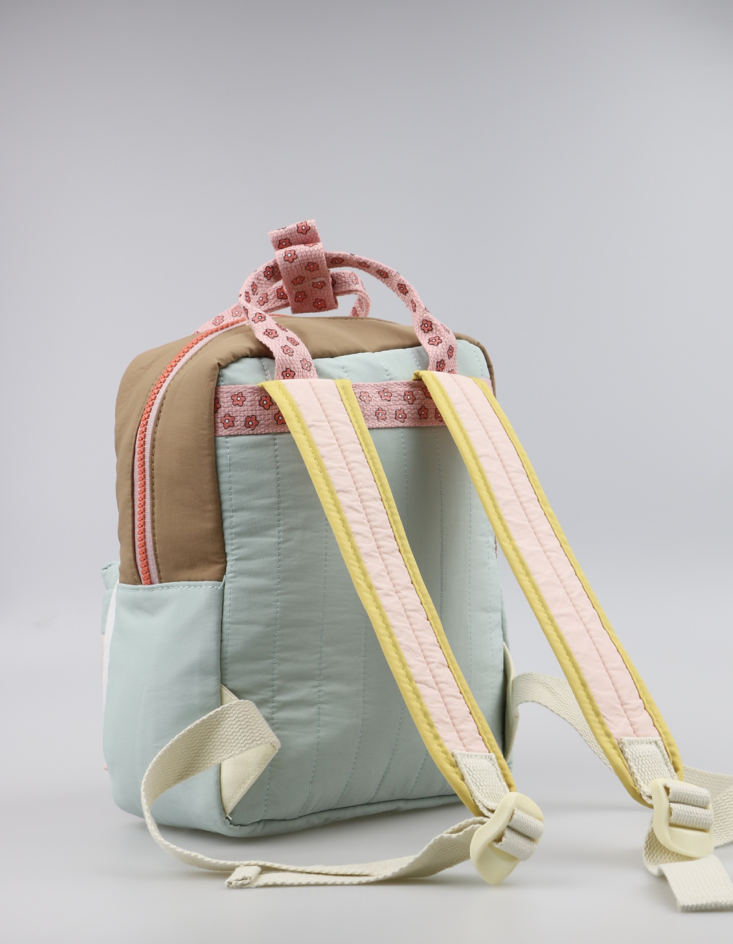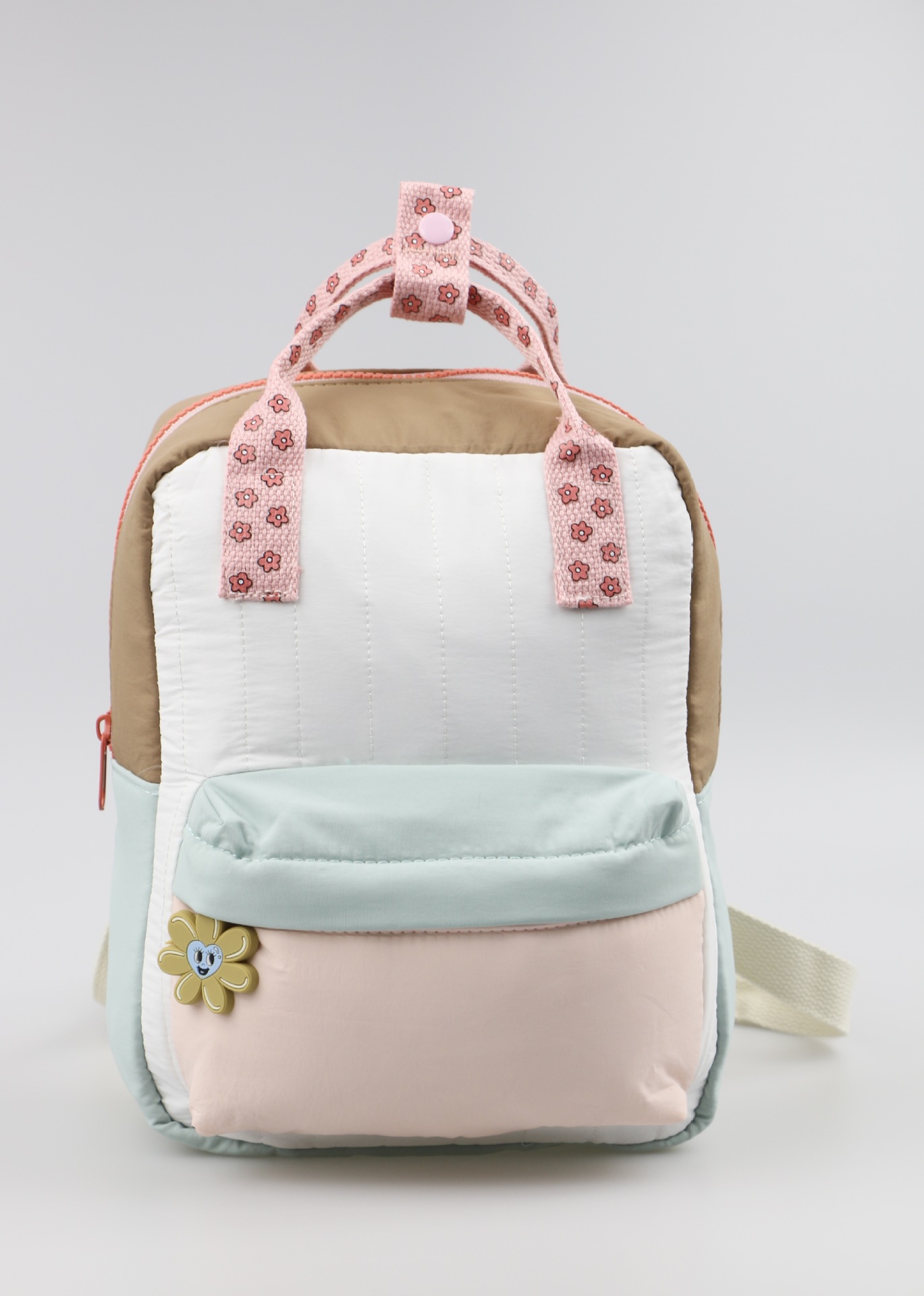 🎀 Design în culori delicate – crem, mentă și roz pudră, accentuate de un fermoar coral pentru un plus de prospețime.