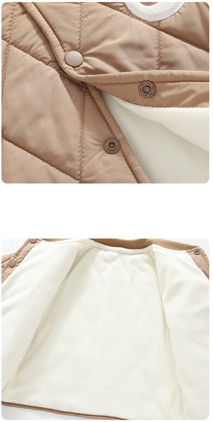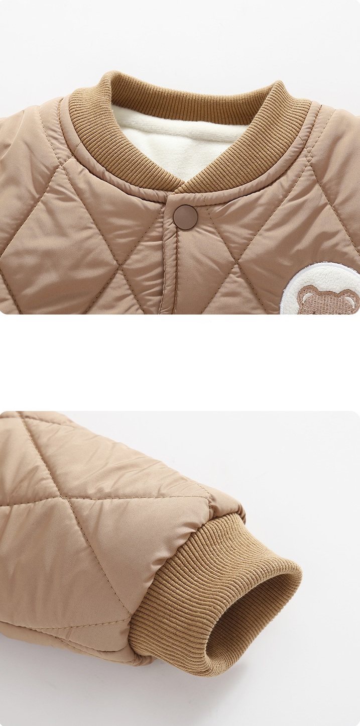 🧸Guler, manșete și tiv din tricot elastic într-o nuanță maro mai închisă, care asigură o potrivire bună și confort suplimentar.