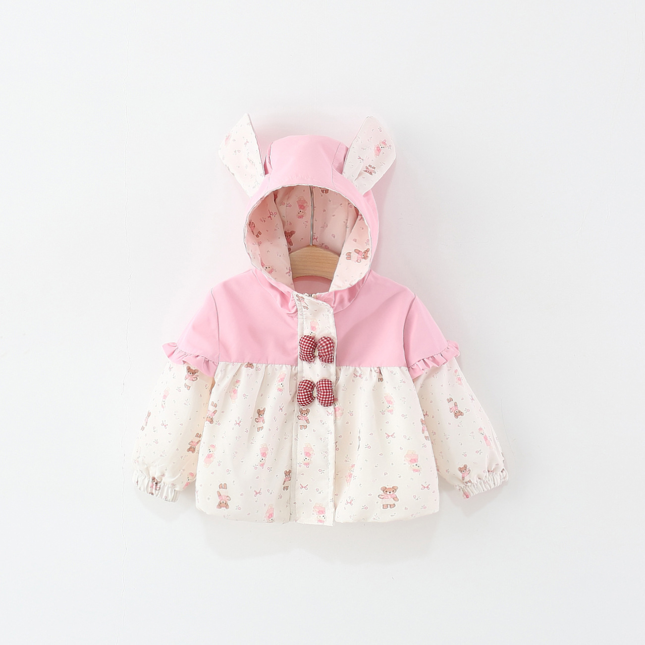 🐰 Glugă cu urechiușe, căptușită și acoperită pe interior cu același imprimeu cu ursuleți.