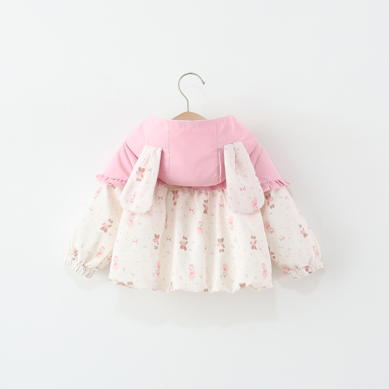 Jachetă premium cu glugă cu urechiușe, volănașe și elemente 3D Teddy Whimsy