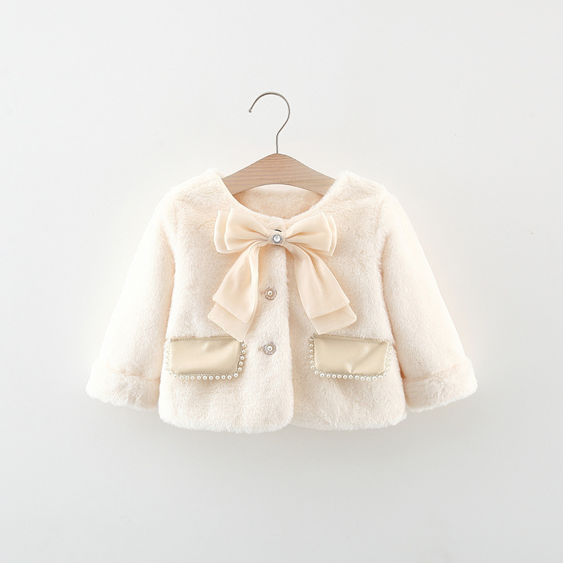 Palton din pluș cu fundiță 3D frumoasă și buzunare decorative din piele Blush Royale Vanilla