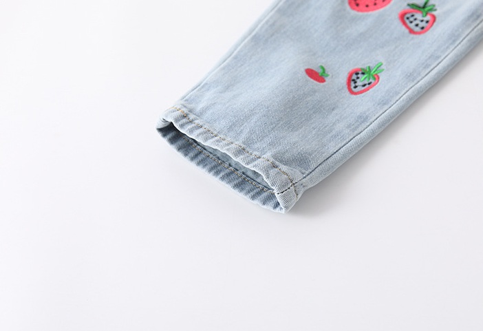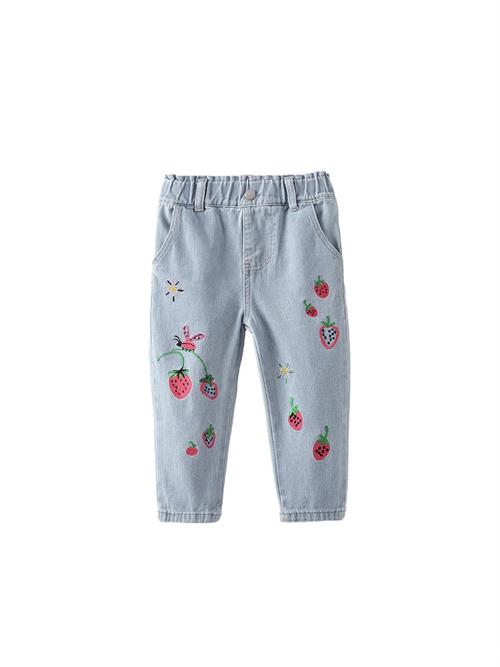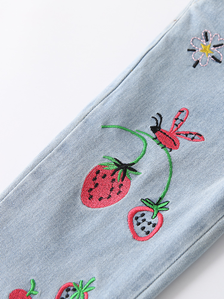 🍓 Pantalon din denim dulce și stilat pentru fetiță, care îmbină confortul cu un design jucăuș și detalii frumos brodate.