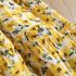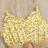 🥰 Partea superioară cu decolteu încrețit – realizată din material de calitate superioară, cu imprimeu de floricele galbene miniaturale și frunzulițe verzi pe un fundal alb aerisit.