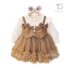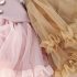 🎀 Fusta este confecționată dintr-un tutu bogat, cu mai multe straturi de tulle în culoare caramel, cu volane frumos conturate la tiv, care oferă un volum de basm și mișcare.