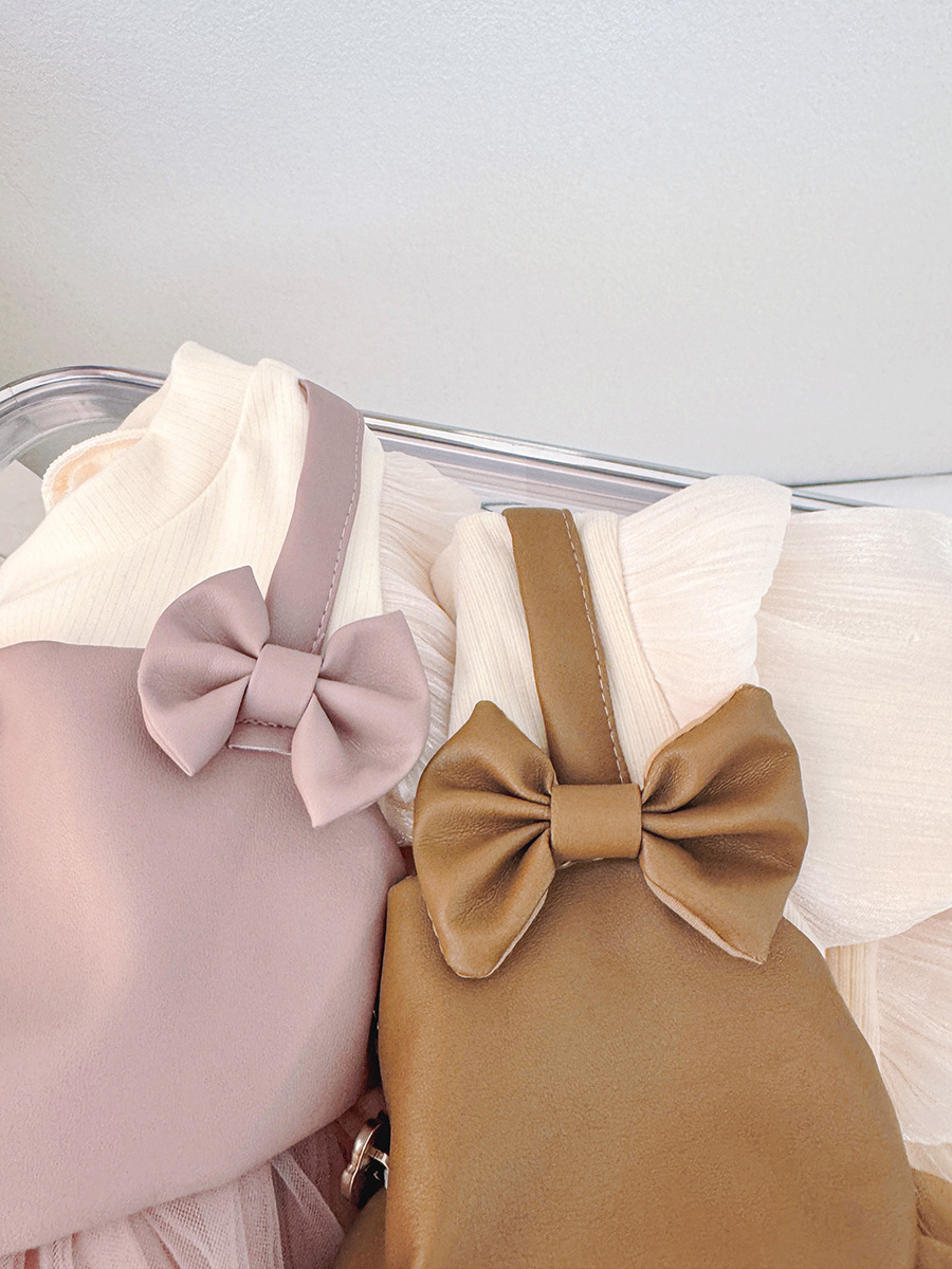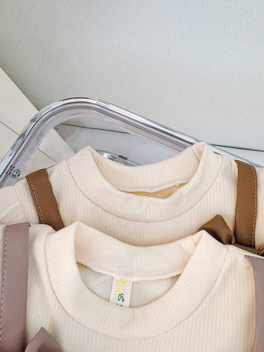 🎀 Partea superioară este realizată din material rib de înaltă calitate și un top stilat din piele ecologică într-o nuanță caldă de caramel, cu bretele subțiri și două fundițe cochete în față. Butonașele decorative adaugă un accent fin și elegant.