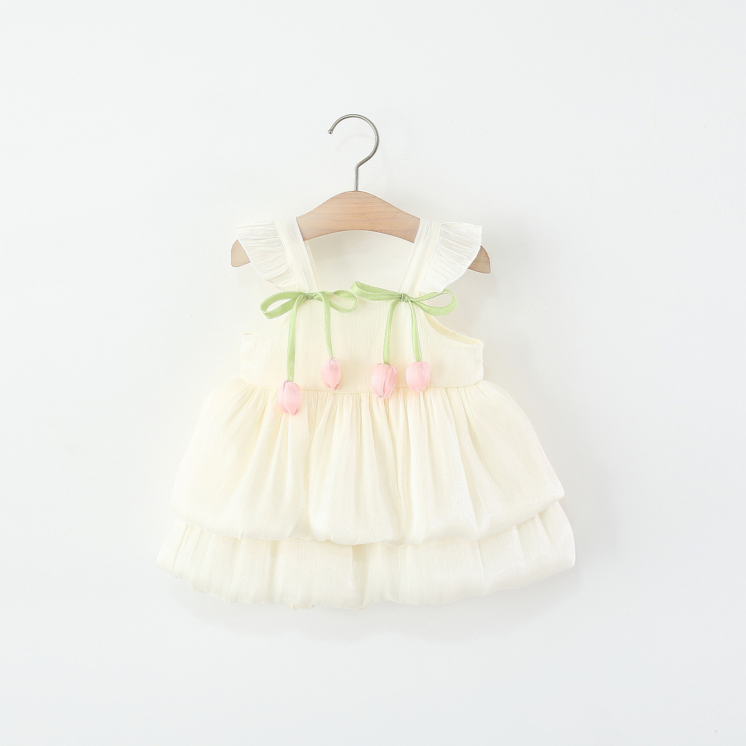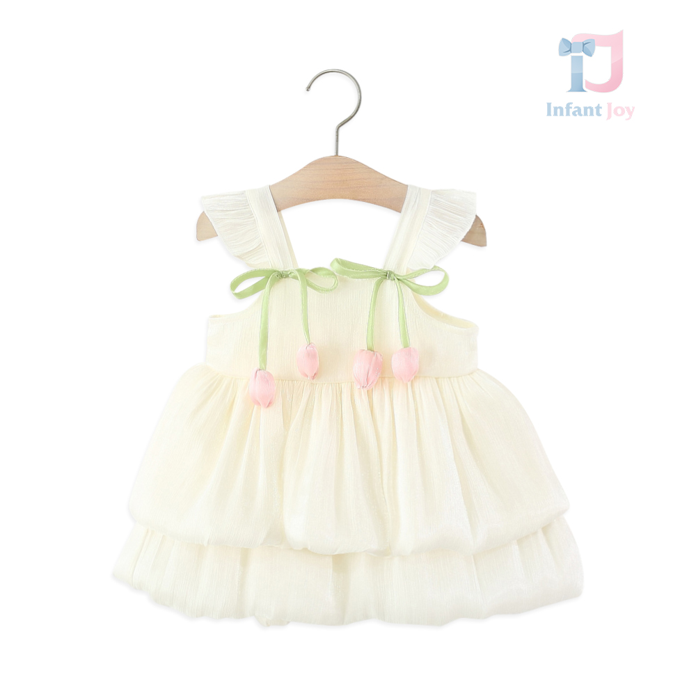 🤍Accentul principal: flori textile tridimensionale tip „lalele“, atașate sub bust cu fundițe verzi.