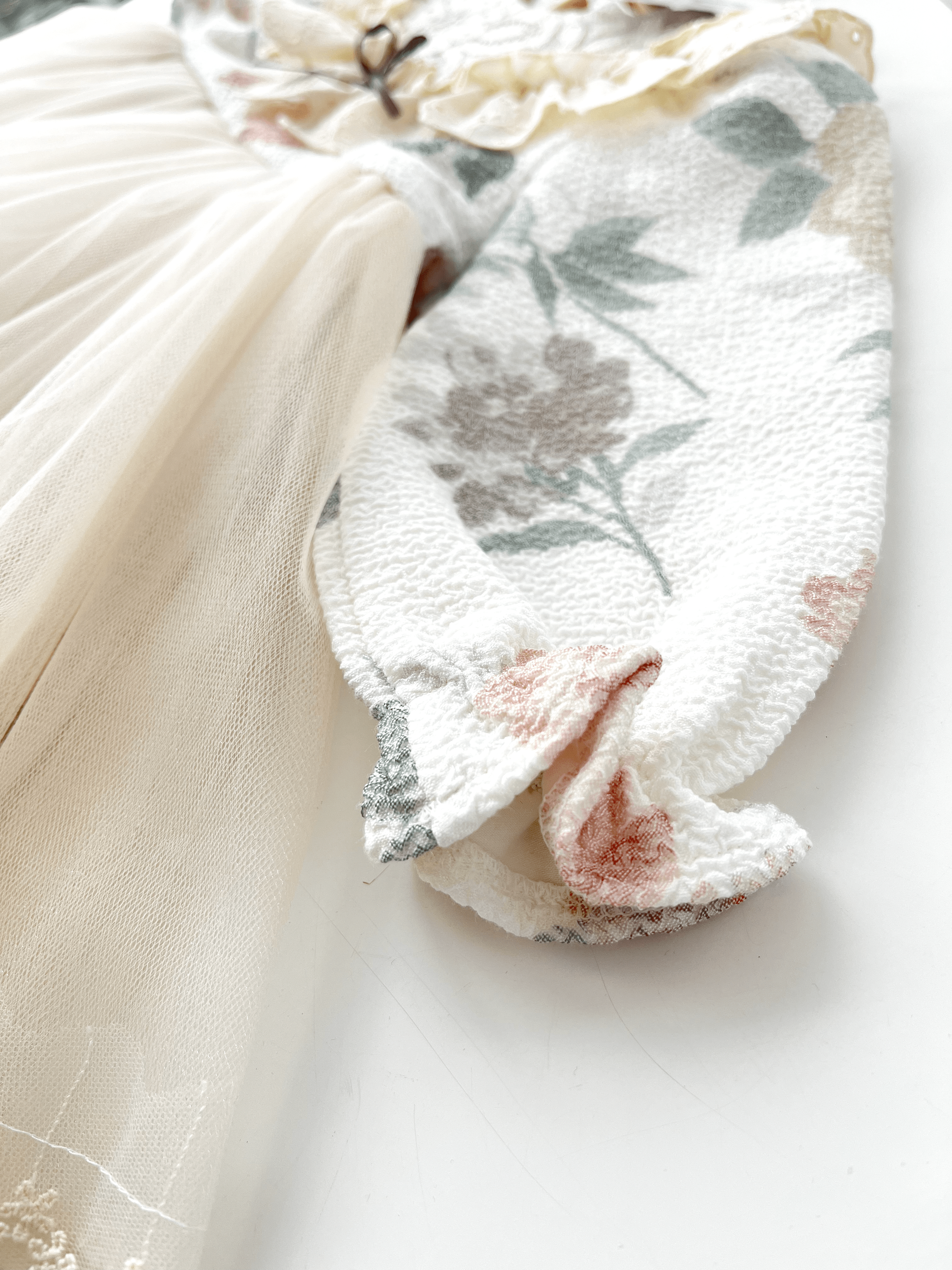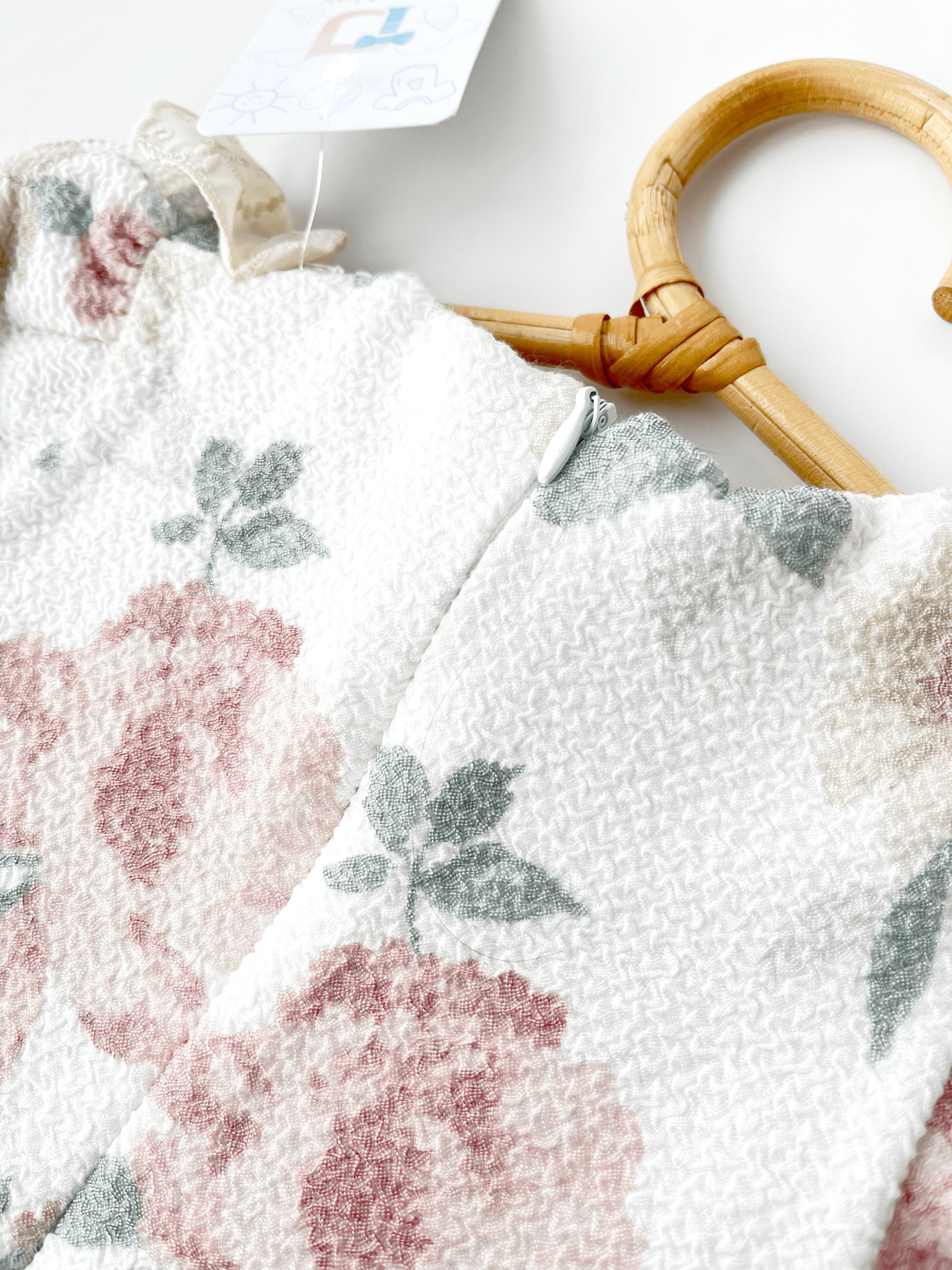 🎀 Partea de sus este realizată din material jacard moale, decorat cu un imprimeu floral în tonuri pastelate de roz și crem.