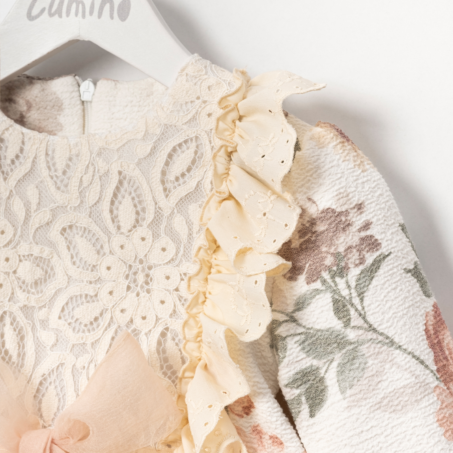 Rochie premium cu model floral, dantelă franțuzească, volane și fundiță din tul Romantic Ruffles