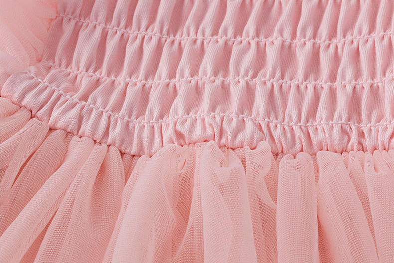 👗 Partea superioară este în nuanță roz-bomboană, cu fronseu tip „smock” ce oferă elasticitate și o potrivire perfectă pe corp
