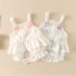 🌷 Model fără mâneci, cu bretele late și cute moi care conferă un aspect romantic. Decorată cu două floricele croșetate care dau un aer hand-made la nivelul bretelelor.