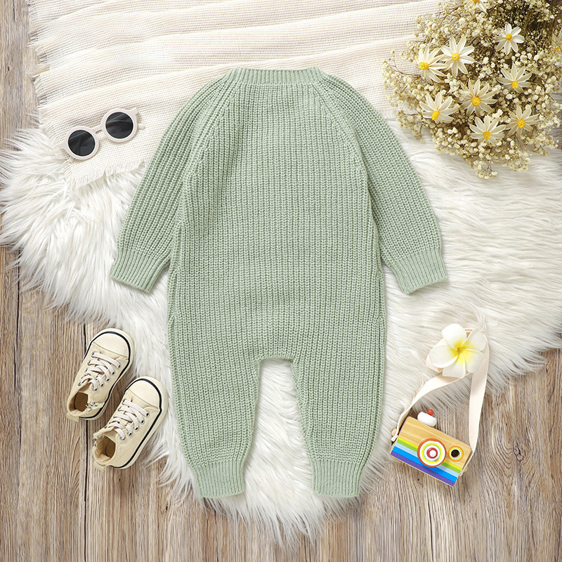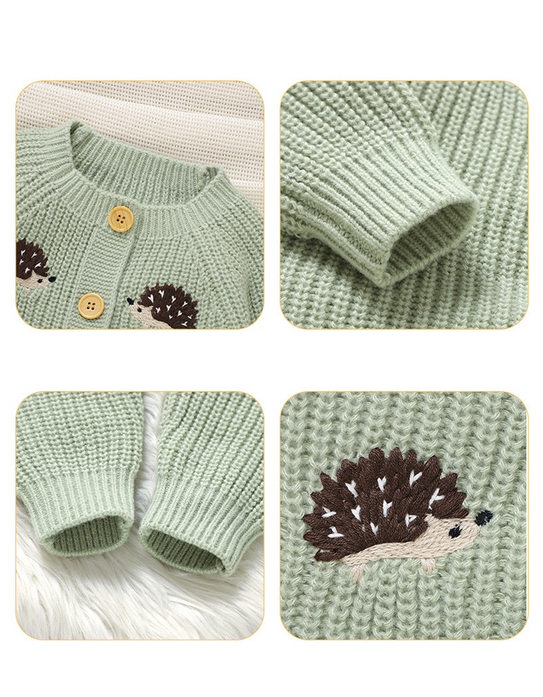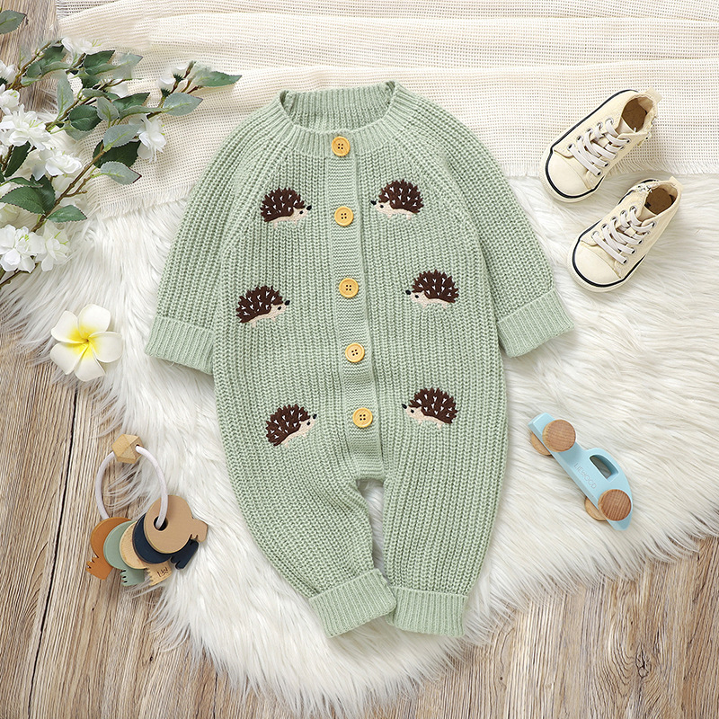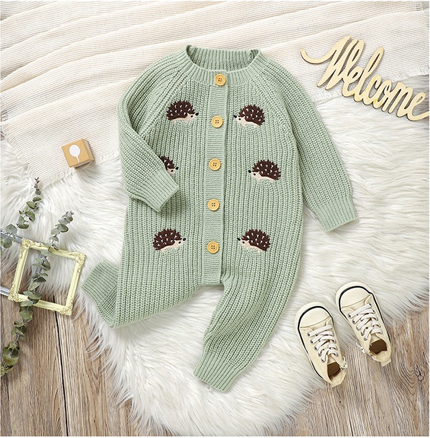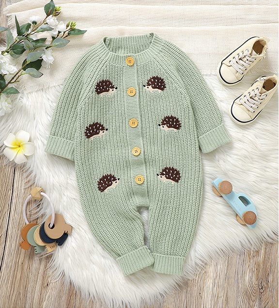 🌿 Salopetă tricotată fermecătoare, într-o nuanță delicată de salvie, cu broderii cu arici – confortabilă, elegantă și creată pentru micii aventurieri cu un aer tandru.