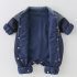 👌 Partea superioară din denim – guler clasic tip cămașă și buzunare decorative cu nasturi, inspirate din jachetele din denim.