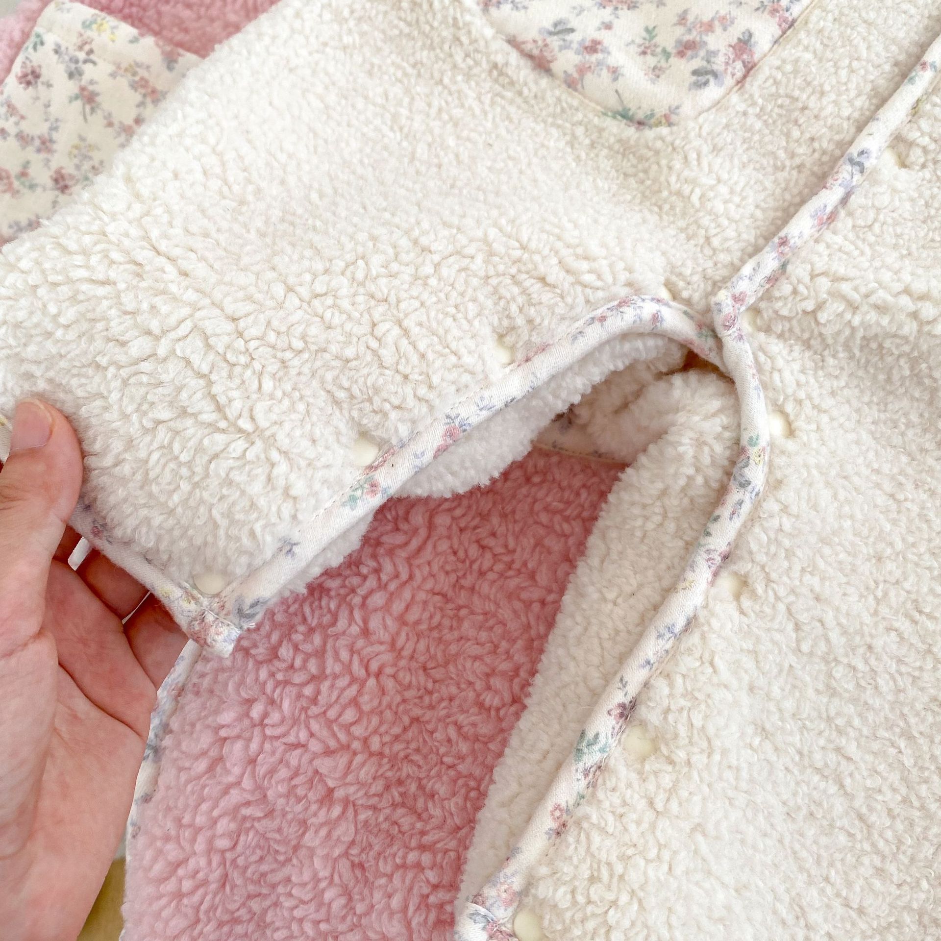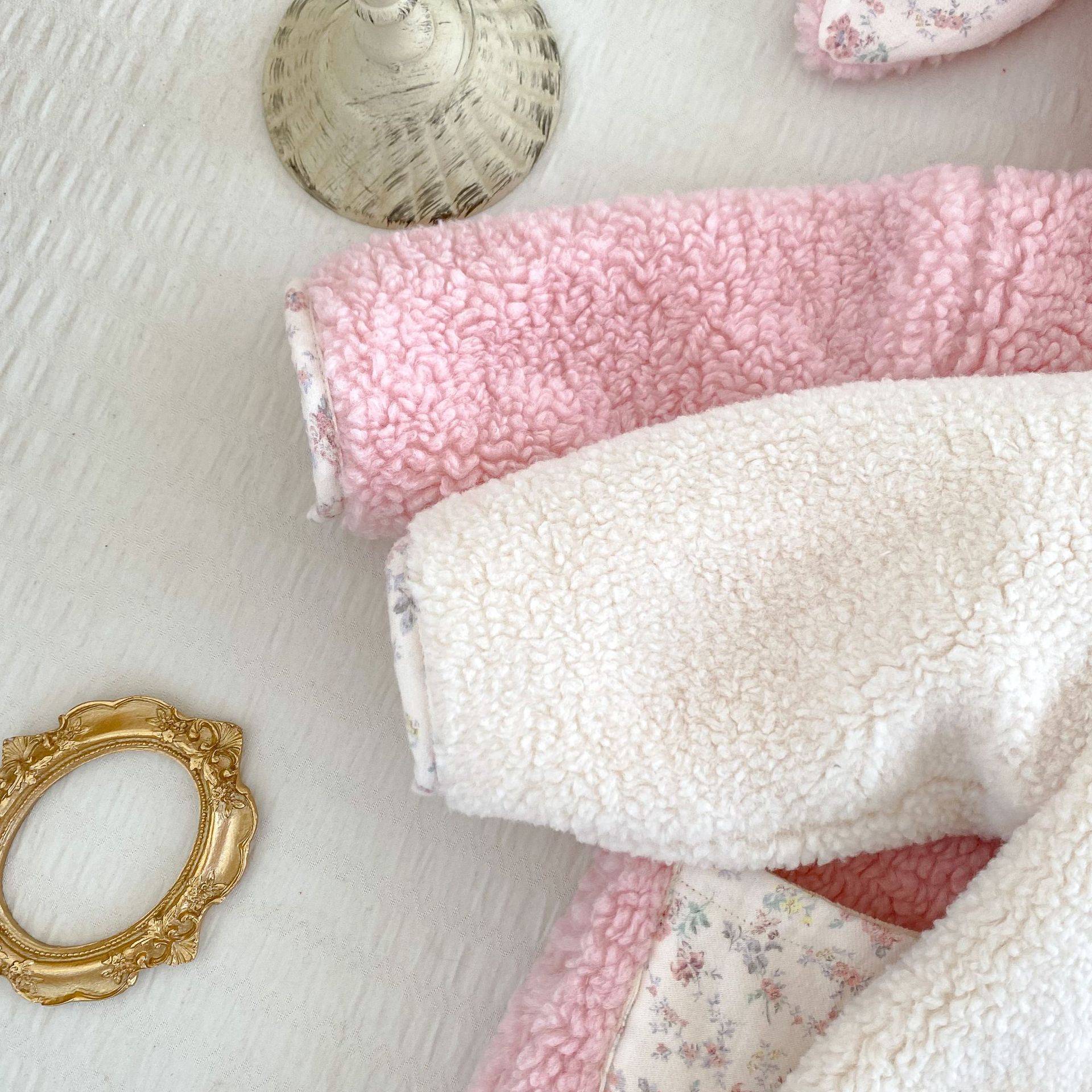 🐰 Detalii florale – buzunarele, tivurile și urechile sunt decorate cu un imprimeu floral elegant, care oferă un farmec vintage.