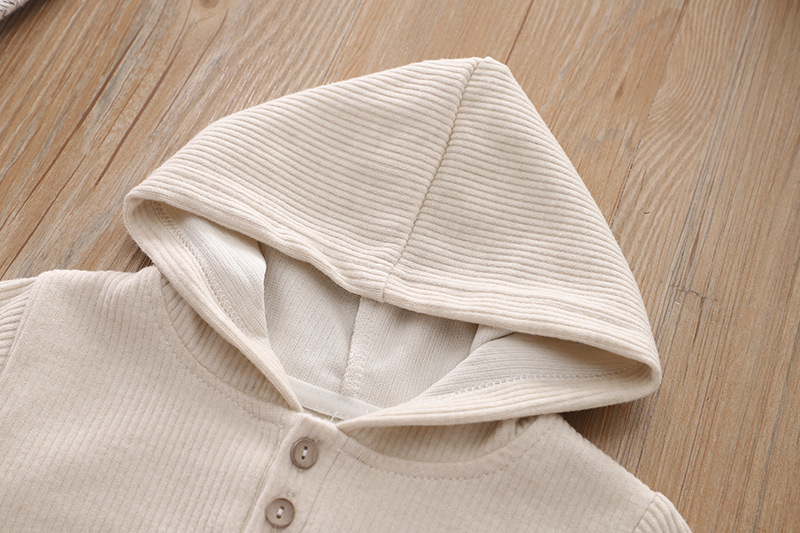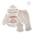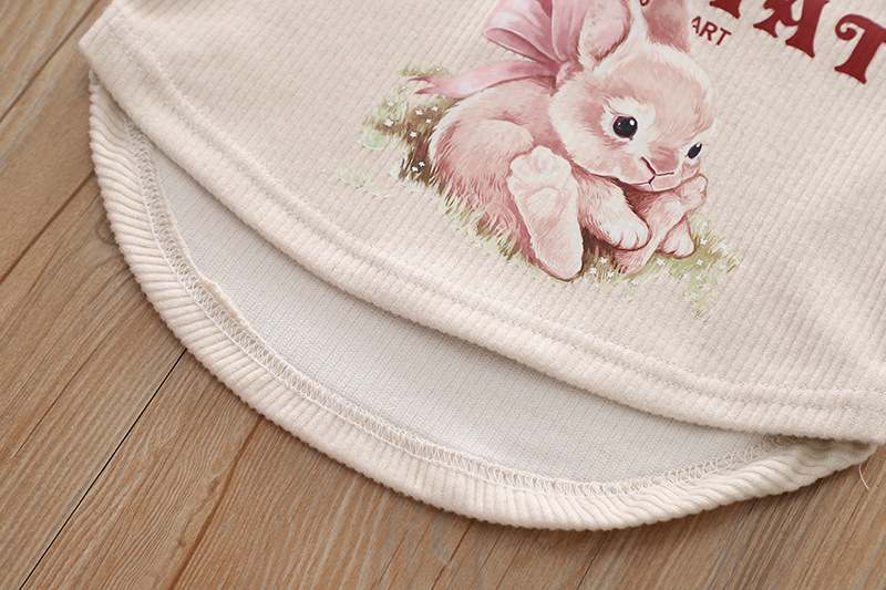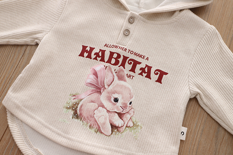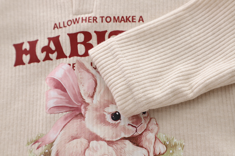 – Hanorac din material rib de înaltă calitate cu efect catifelat, în nuanță bej. Model cu glugă clasică, două capse frontale pentru îmbrăcare ușoară, spate ușor alungit pentru un look modern + imprimeu delicat cu iepuraș, care atrage toate privirile.