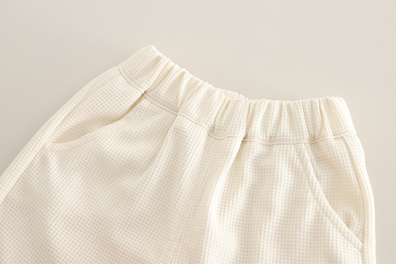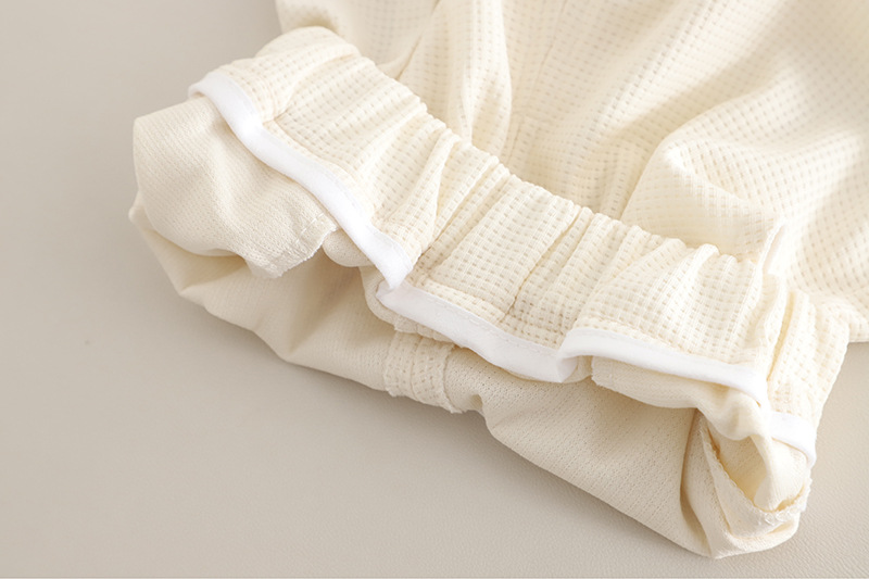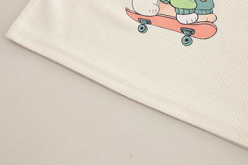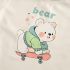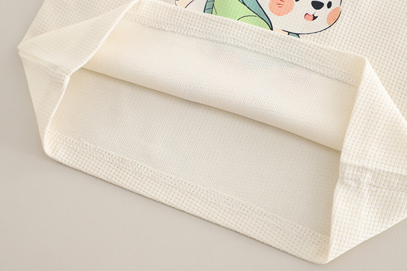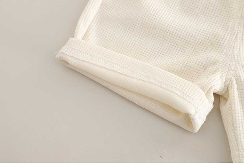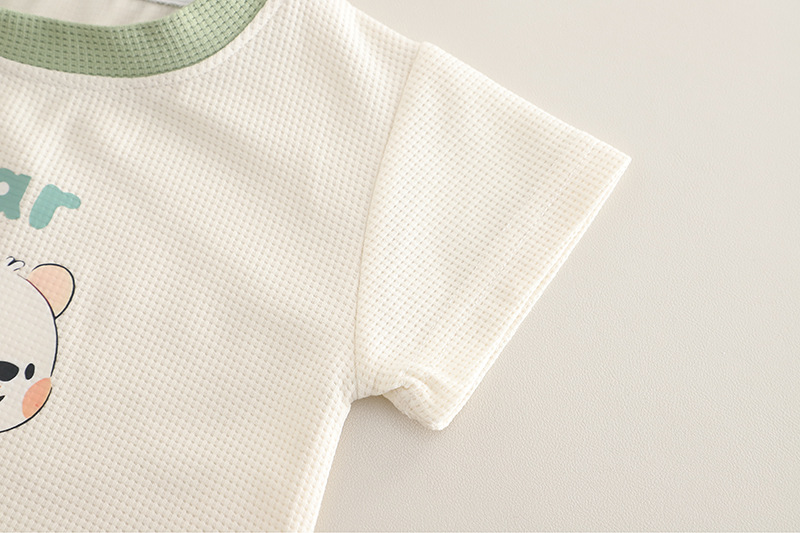 – Tricou realizat din material tip waffle de calitate superioară, în culoarea vaniliei. Model cu croială lejeră și decolteu rotund cu bandă albă contrastantă. Decorat cu un imprimeu mare cu ursuleț din față.