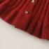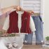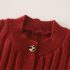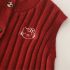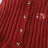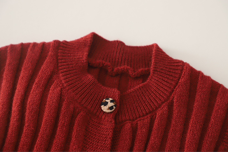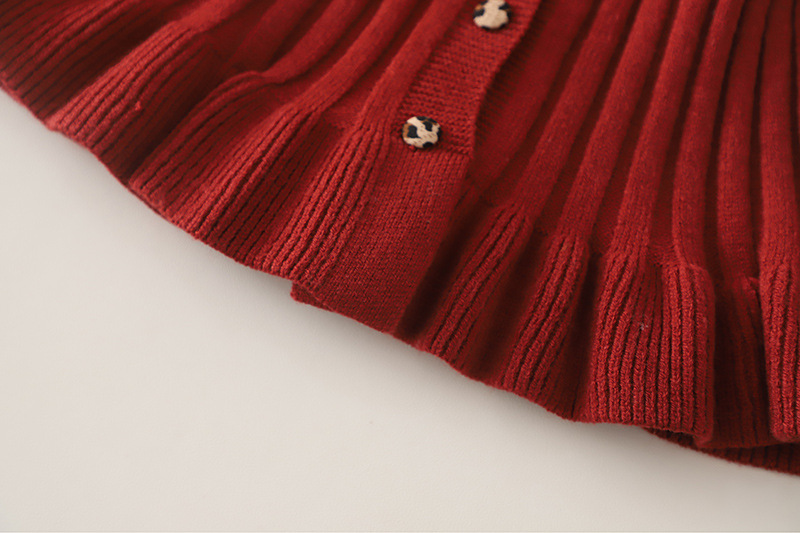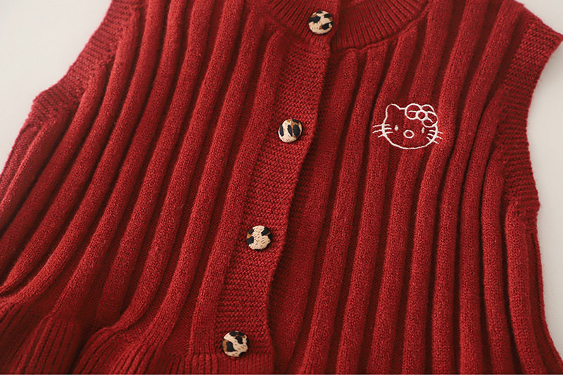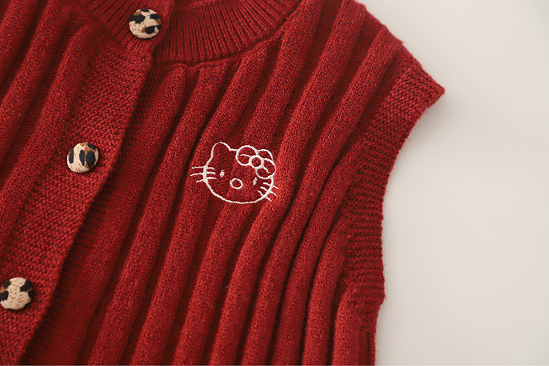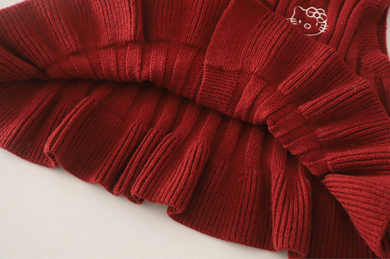 – Vestă tricotată într-o nuanță intensă de bordo, realizată dintr-un tricot moale, cu textură reliefată. Vesta se închide cu nasturi în față și are în partea de jos un tiv cu volane decorative, care oferă un aspect delicat și elegant. Mica aplicație decorativă cu pisicuță adaugă un accent dulce și jucăuș.