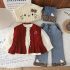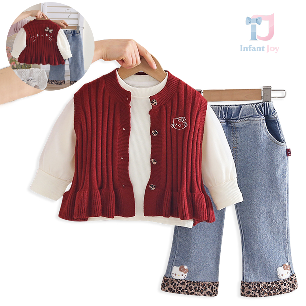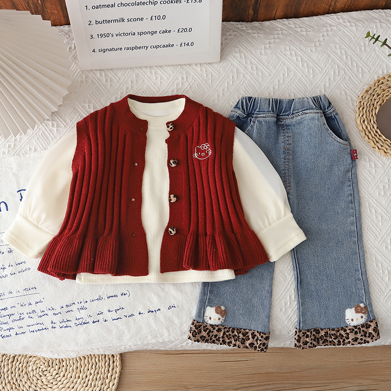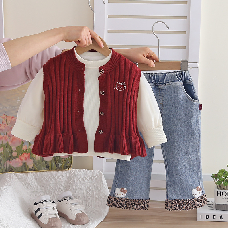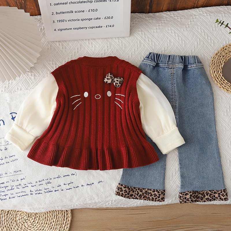 Set cu vestă din tricot, bluză și pantaloni din denim – Mini Kitty