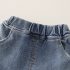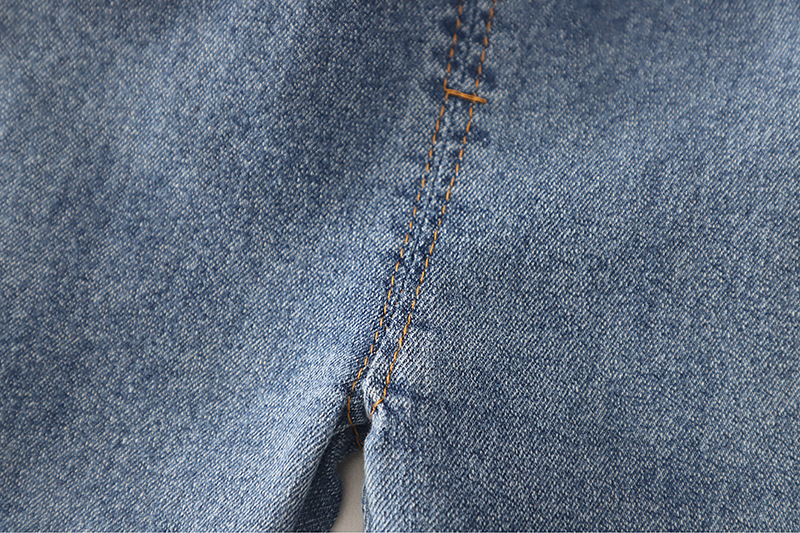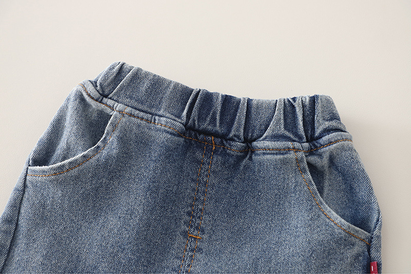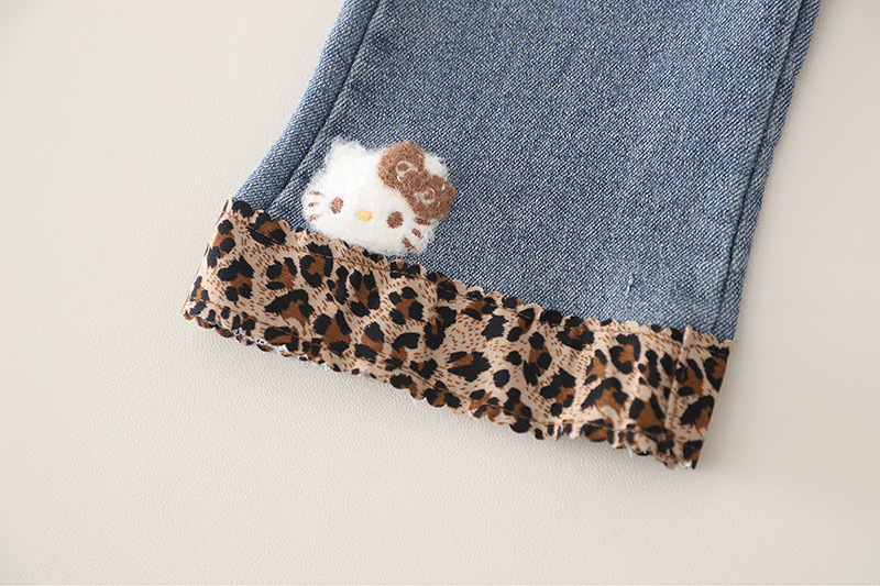 – Pantalon din denim cu buzunare, prevăzut cu talie elastică pentru îmbrăcare ușoară și libertate de mișcare. Cracii sunt decorați cu un model contrastant tip „leopard” și mici aplicații decorative, care oferă o notă modernă și jucăușă.