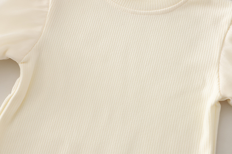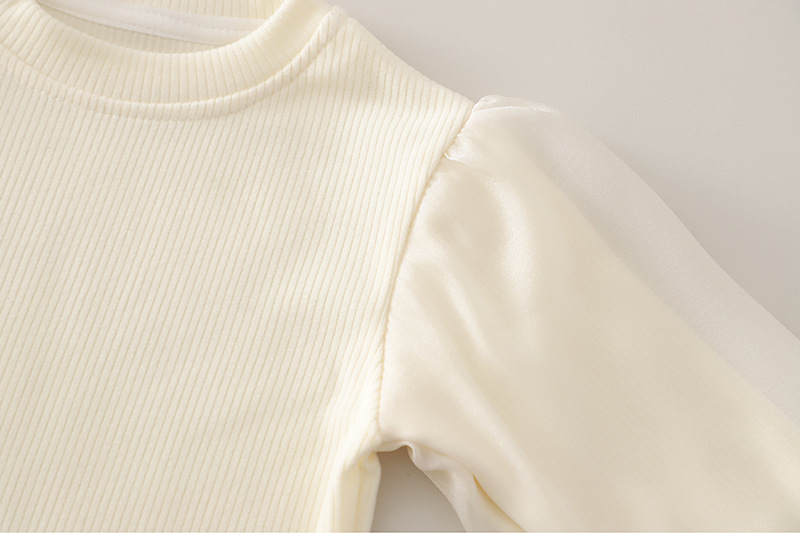 – Bluză cu croială clasică și decolteu rotund, confecționată din material moale și plăcut la atingere. Mânecuțele bufante creează o siluetă frumoasă și stilată, completând aspectul elegant al setului.