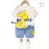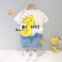 – Bluză/tricou cu mânecă scurtă, albă, cu multiple aplicații și imagine cu o girafă mare în partea din față + codiță 3D atârnată.