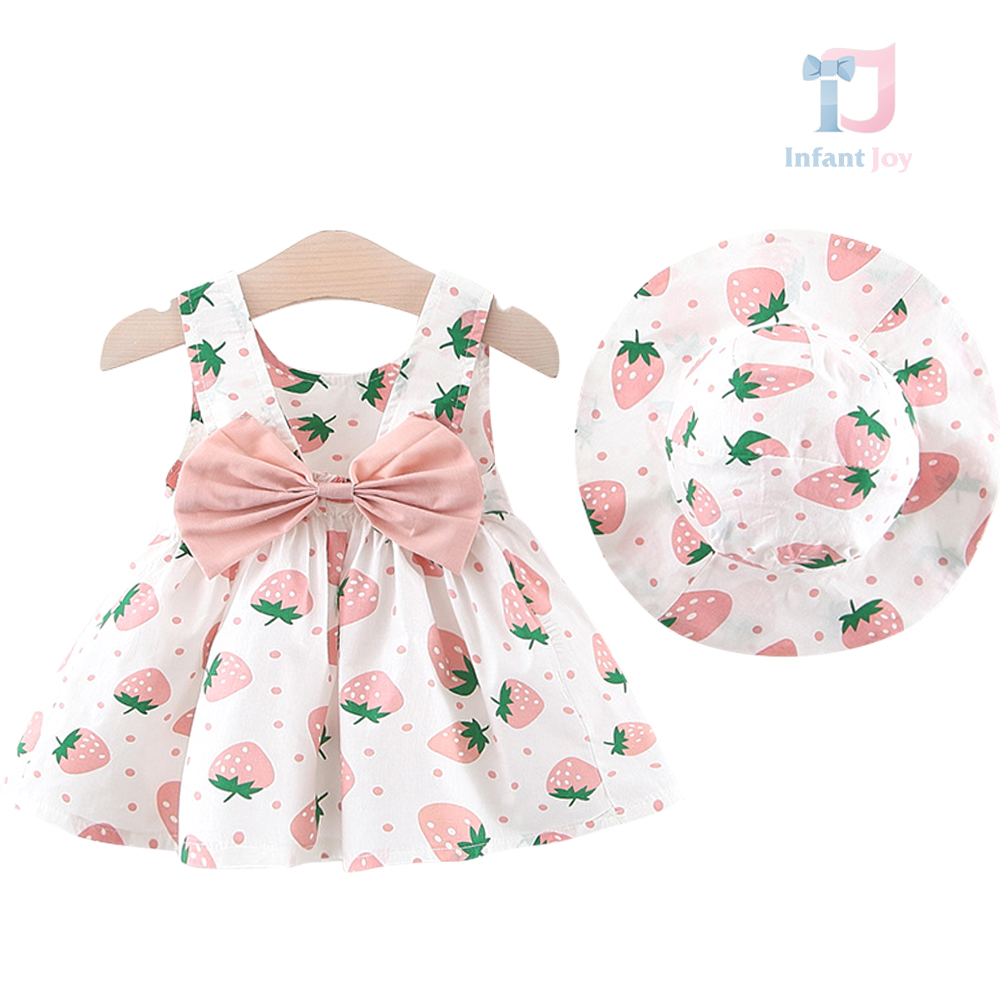 – Rochiță de plajă din bumbac ușor și de calitate superioară, albă, cu imprimeu cu căpșuni roz. Croială evazată, spate gol, elastic și fundiță decorativă în partea din spate