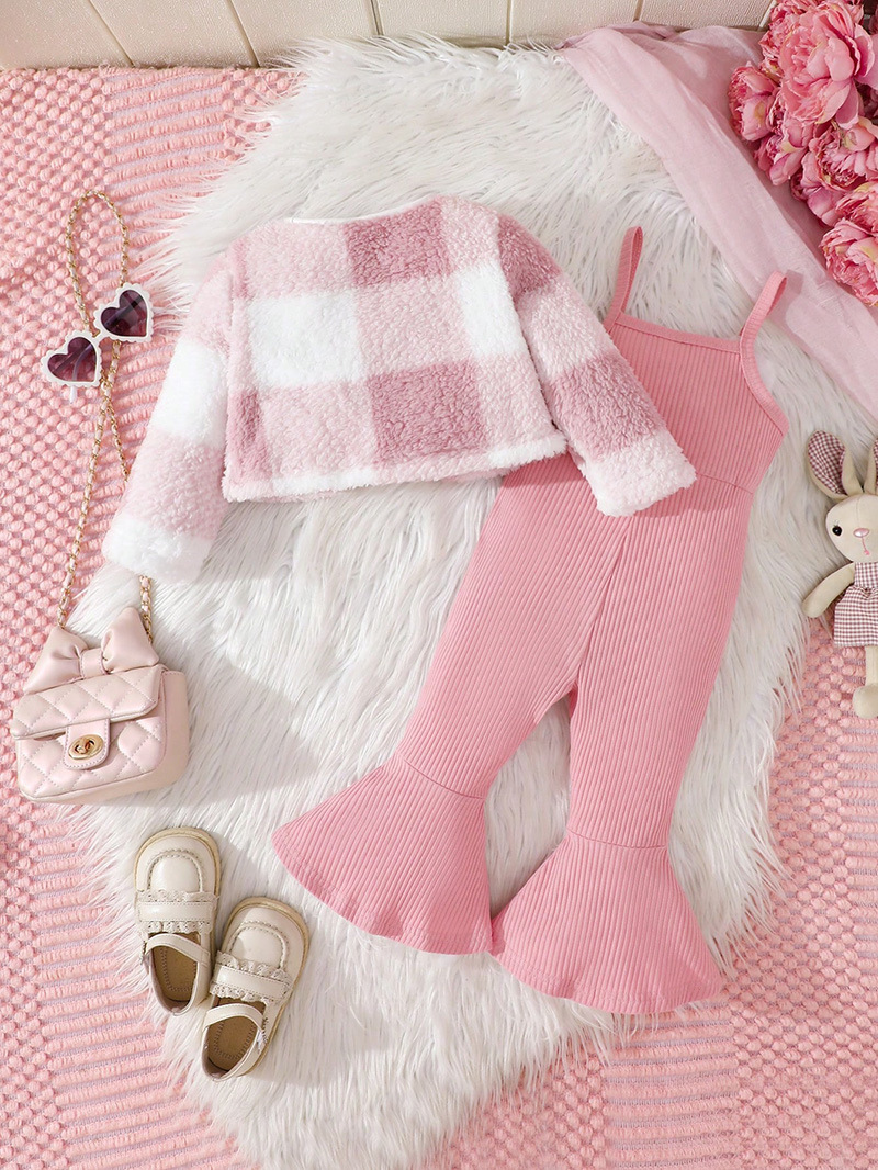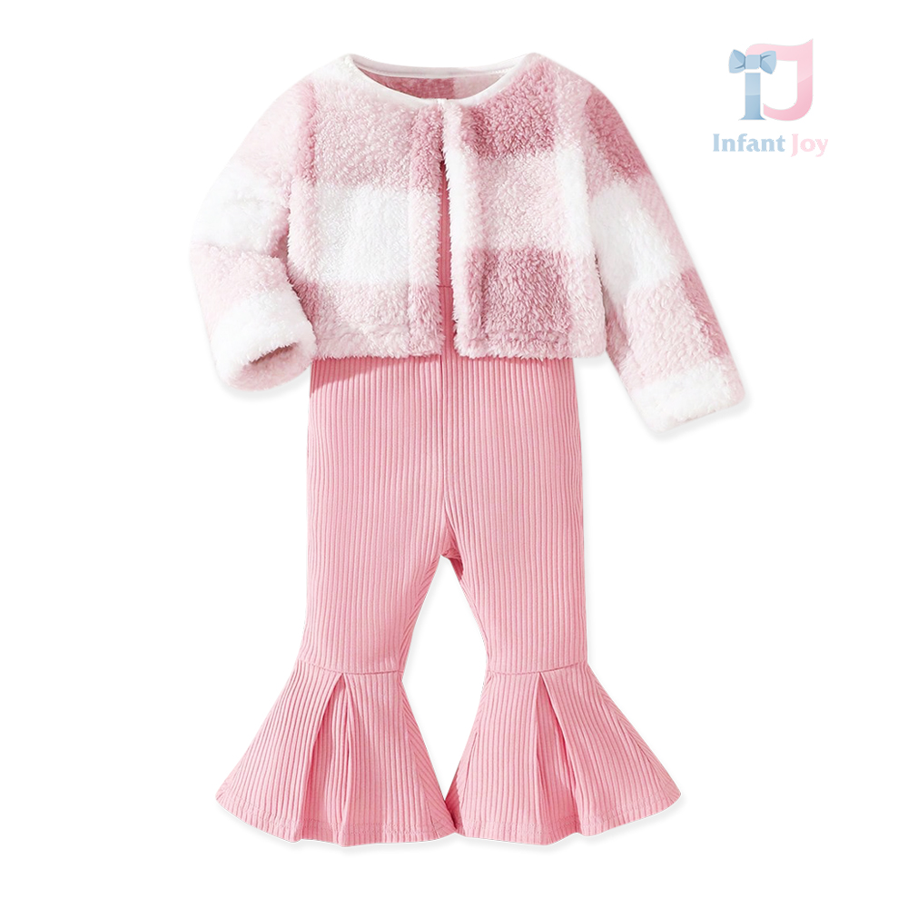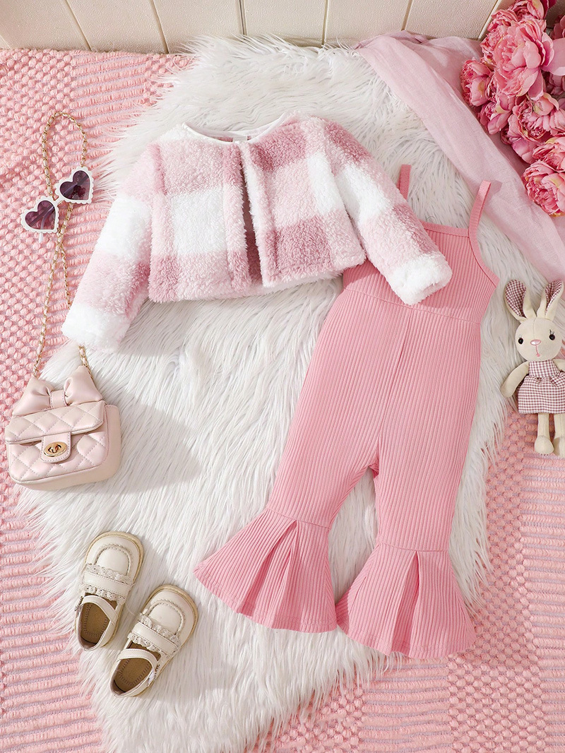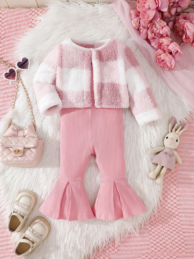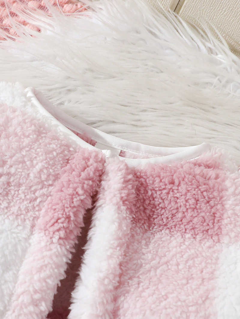 – Sacou din pluș – model scurt și foarte moale, cu croială simplă, în combinație delicată roz-alb cu efect de carouri. Materialul este pufos și călduros, oferind o senzație luxoasă și un accent fashion perfect pentru întreaga ținută. Se încheie cu un singur nasture în partea superioară.