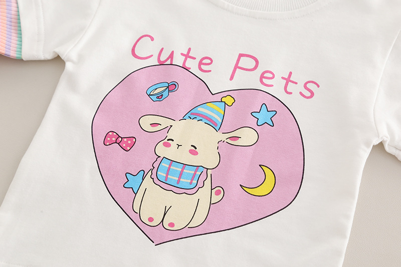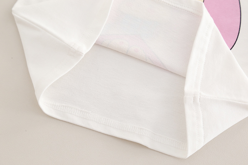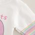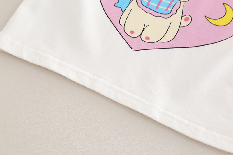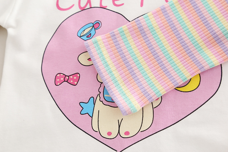 – Bluziță albă din material moale de bumbac, cu decolteu rotund. Mâneci lungi din rip pastel curcubeu pentru efect „două în unu“. Imprimeu central roz cu fundal în formă de inimă și un iepuraș zâmbitor în mijloc.
