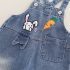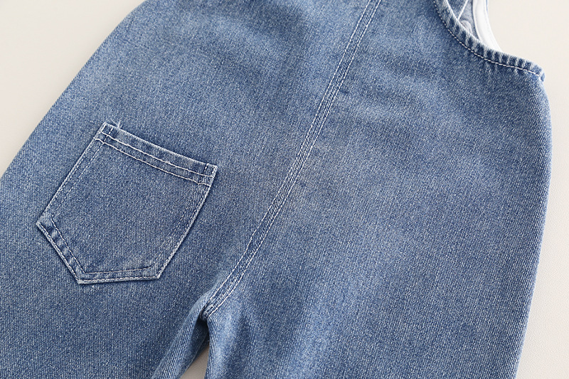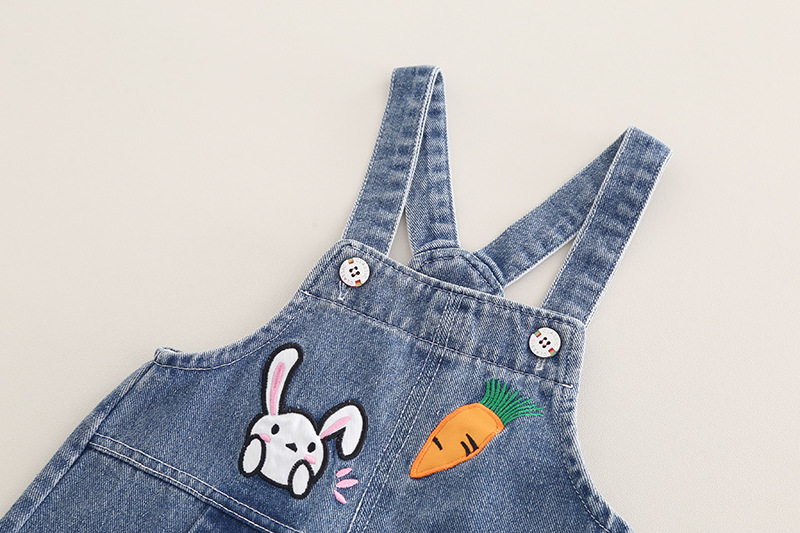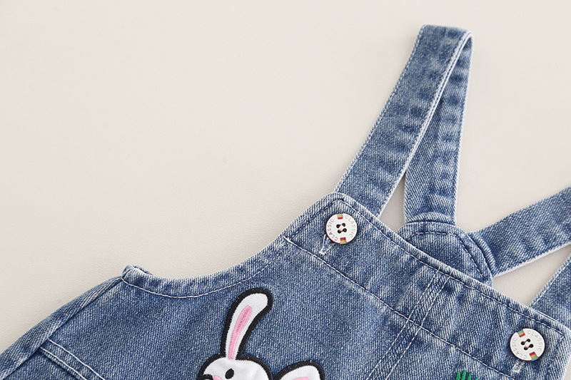 – Salopetă din denim cu bretele, închidere cu nasturi. Buzunar frontal „cangur“ cu cap 3D plușat de iepuraș și aplicație de morcov. Două buzunare funcționale la talie și tivuri suflecate la pantaloni pentru confort.