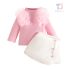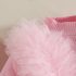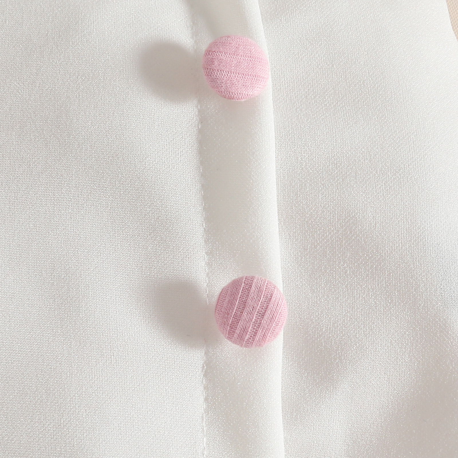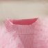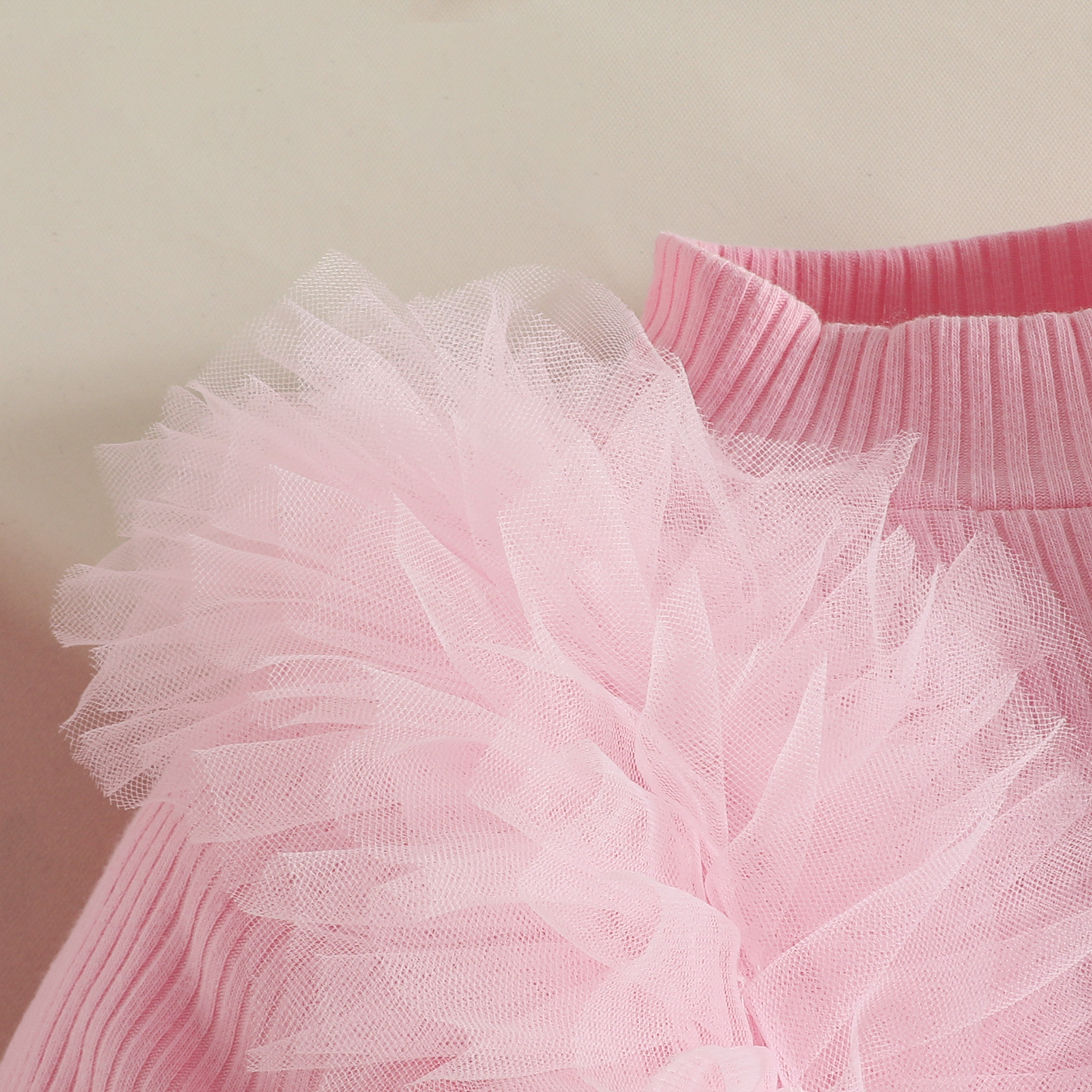 – Bluză roz pastel, din material rib fin cu puțin elastan pentru flexibilitate. Guler rotund, mâneci lungi și două rânduri de volănașe din tul pe umeri – pentru un finisaj romantic și delicat.