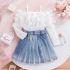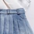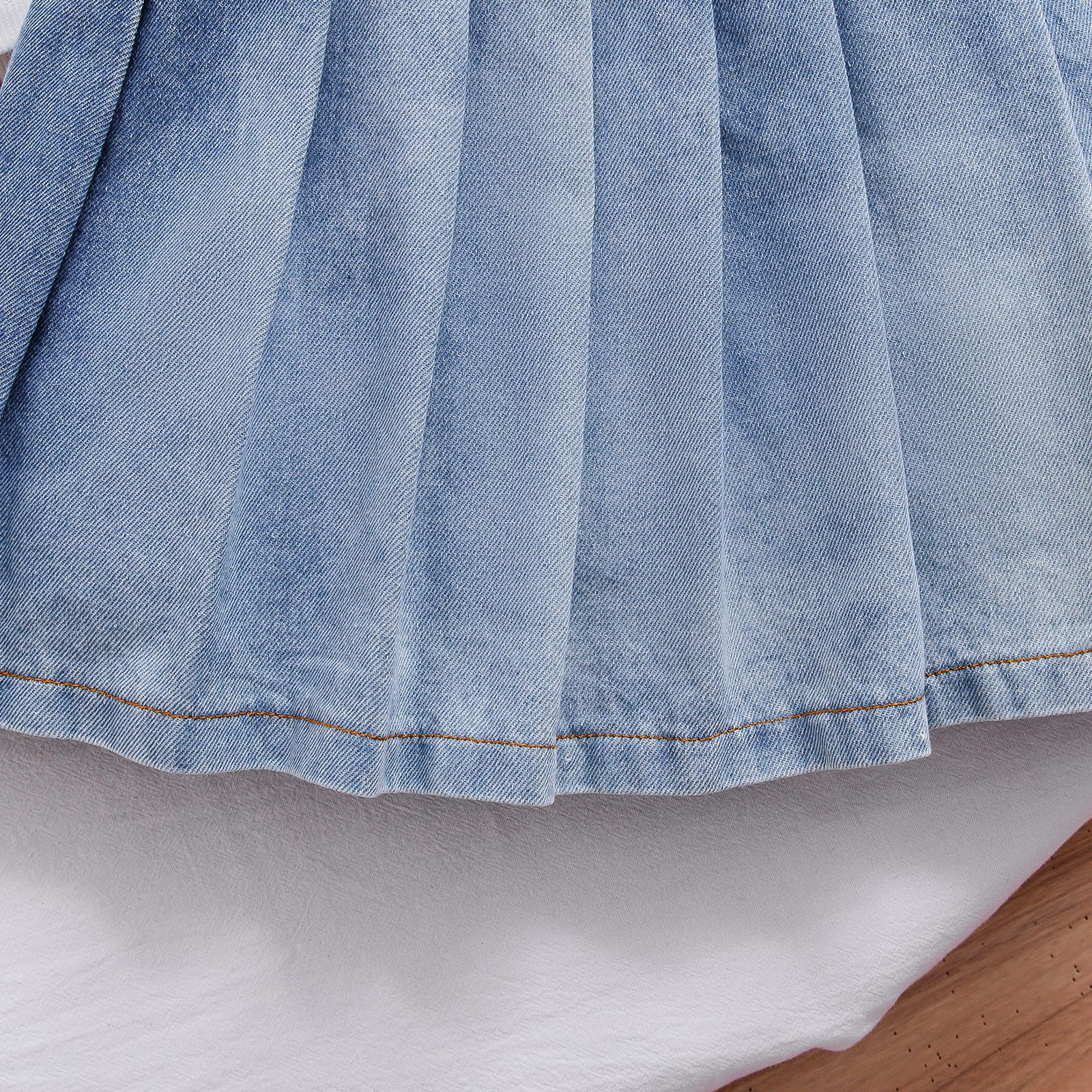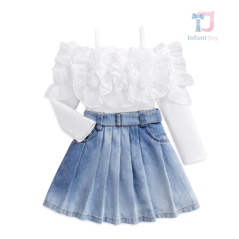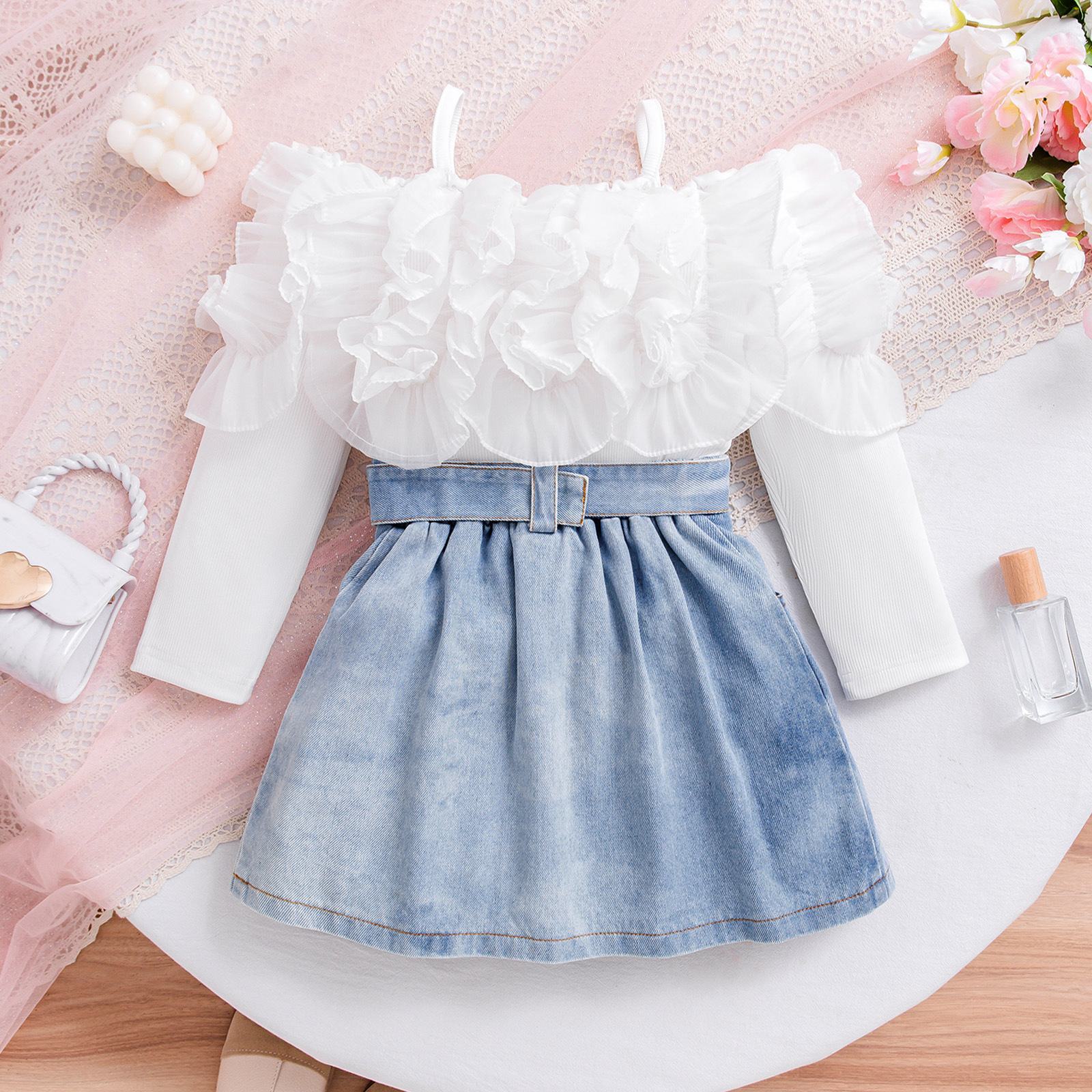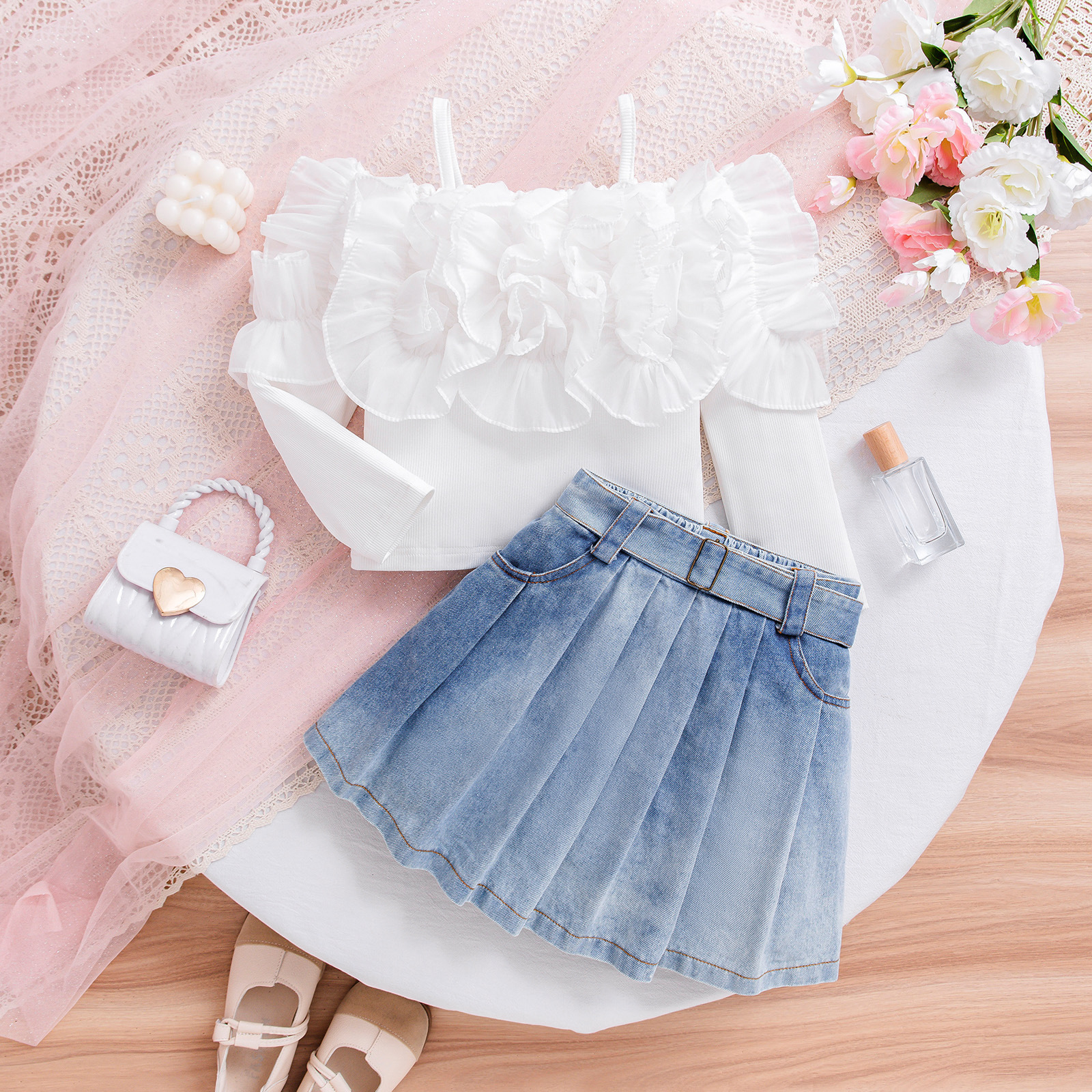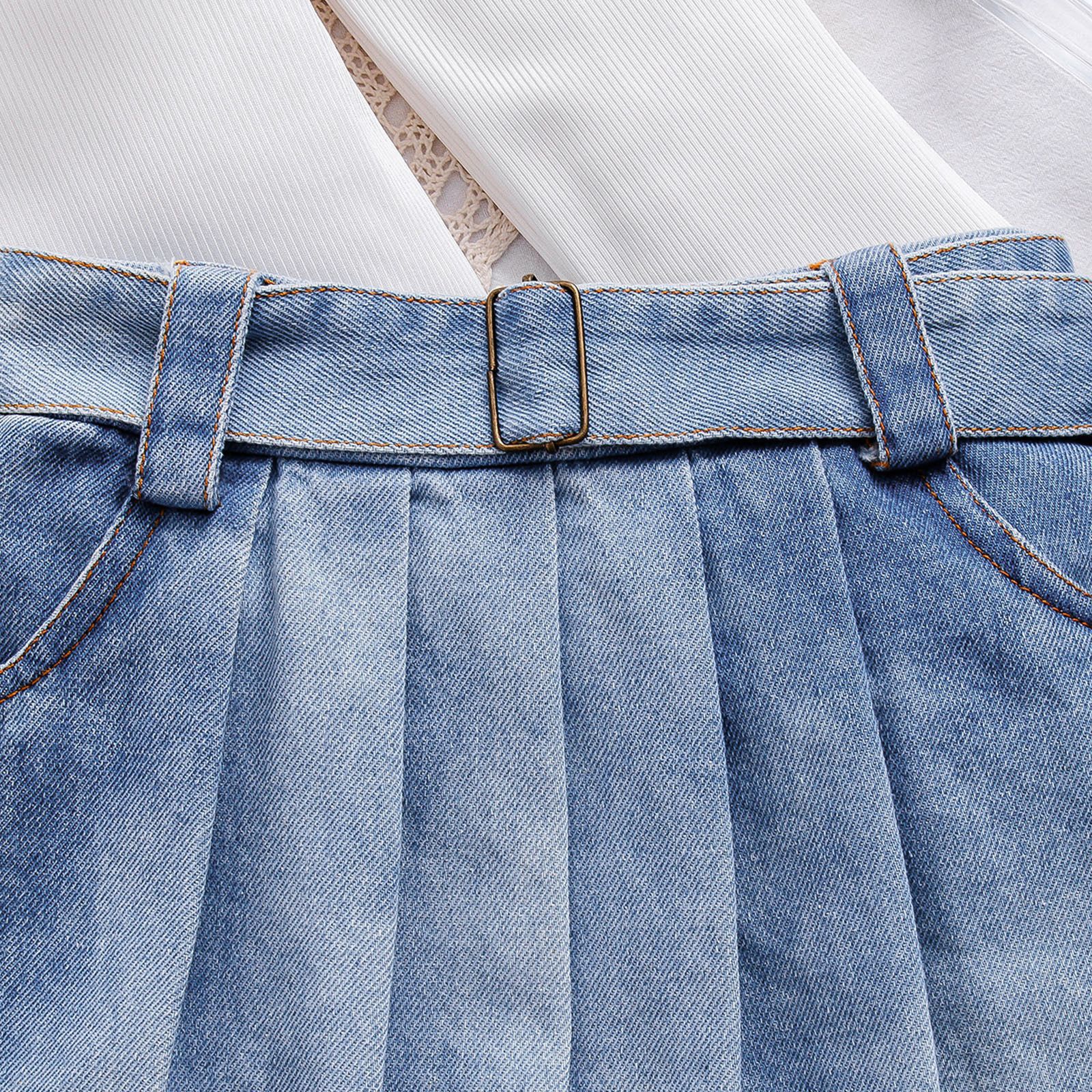 Set de 2 piese cu bluză cu volane voluminoase, fustă plisată din denim și curea Denim Muse