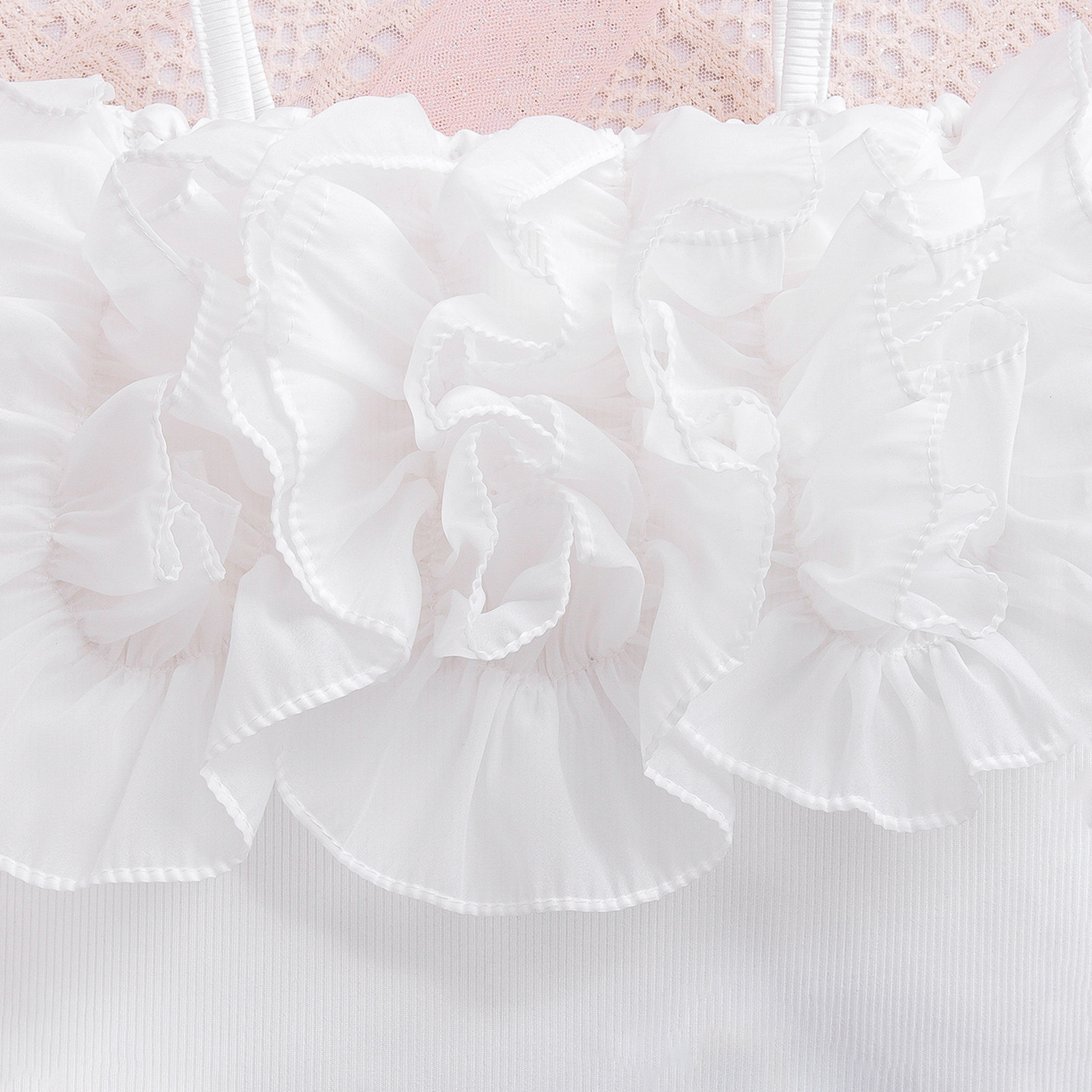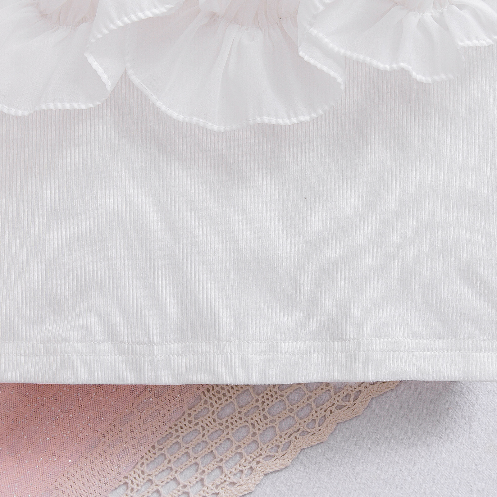 -Bluză cu mânecă lungă și volane ample – realizată din material reiat moale și elastic, în alb imaculat, ce se așază confortabil pe corp. Partea din față este decorată cu multiple volane delicate, care creează un aspect aerat și romantic. Bretelele subțiri adaugă eleganță și echilibrează designul – o bluză ce îmbină finețea cu rafinamentul.