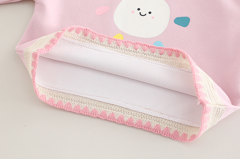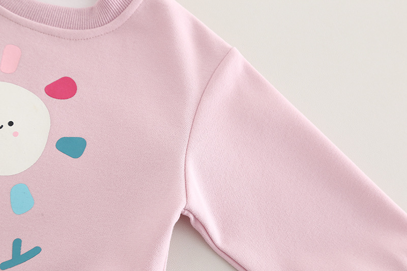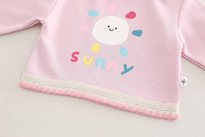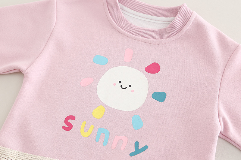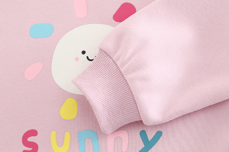 – Bluză/Hanorac din bumbac moale, cu croială clasică lejeră și mâneci lungi. Decorată în partea din față cu un imprimeu vesel cu soare zâmbitor și inscripția „sunny” în culori vesele. Partea de jos a bluzei este accesorizată cu o bandă decorativă cu margine zimțată, în alb și roz contrastant.
