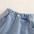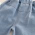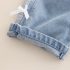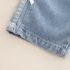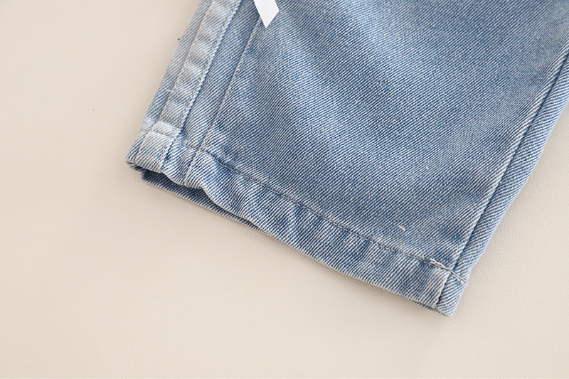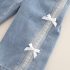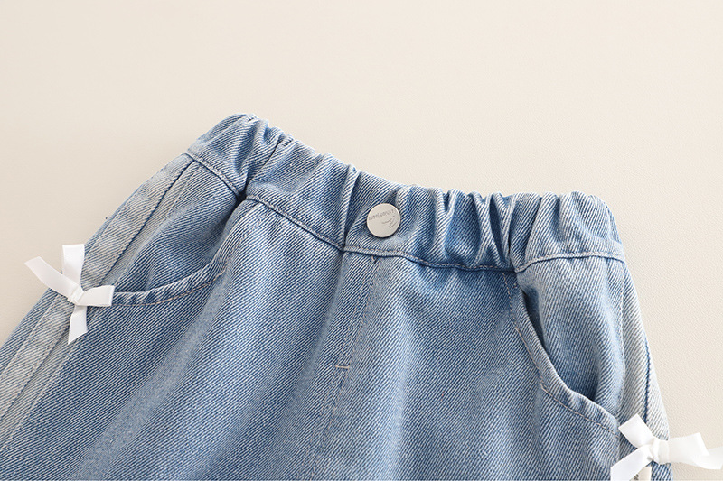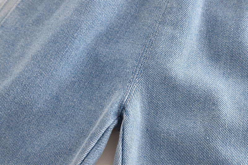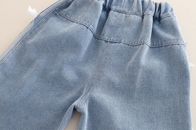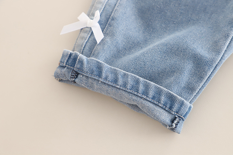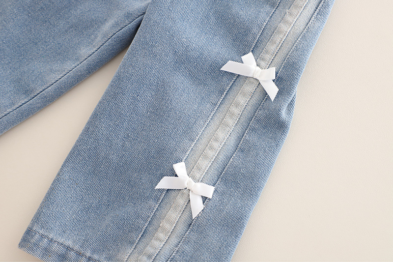 – Pantaloni din denim albastru mediu, cu talie elastică și închidere cu capse metalice pentru o îmbrăcare ușoară. Doi buzunare laterale funcționale și un șir de fundițe 3D albe de-a lungul cusăturii laterale a cracilor. Manșete rulate la glezne pentru libertate de mișcare.