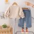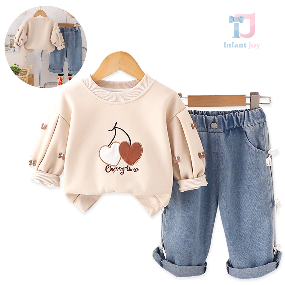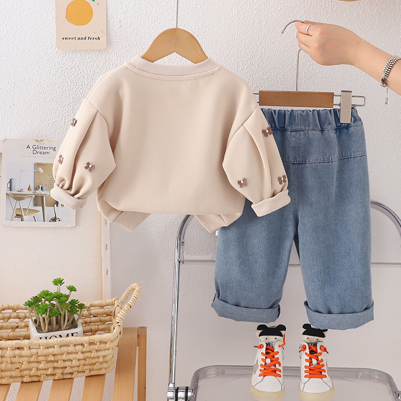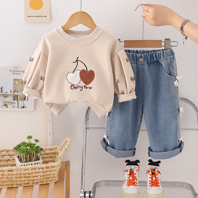 Set de 2 piese cu bluză/hanorac cu funde 3D și pantaloni din denim Cherry Ribbon