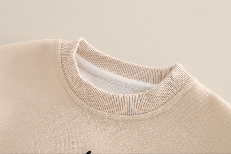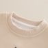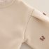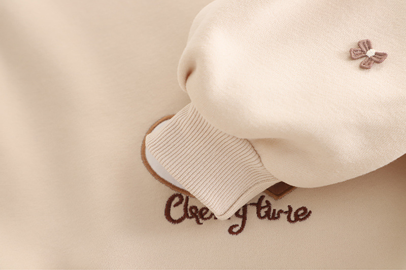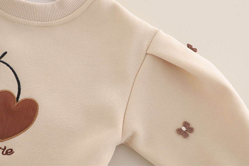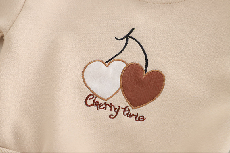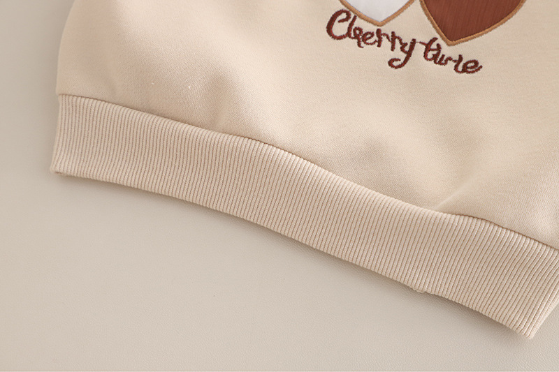 – Hanorac în nuanță crem-cafeniu, confecționat din bumbac de înaltă calitate, cu decolteu rotund. Mâneci bufante cu manșete elastice și aplicații 3D „fundițe” în aceeași nuanță, distribuite uniform pe brațe. Broderie centrală „Cherry time” cu două cireșe sub formă de inimioară – una albă, cealaltă cafenie caldă.