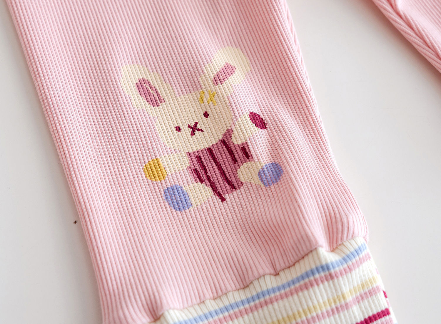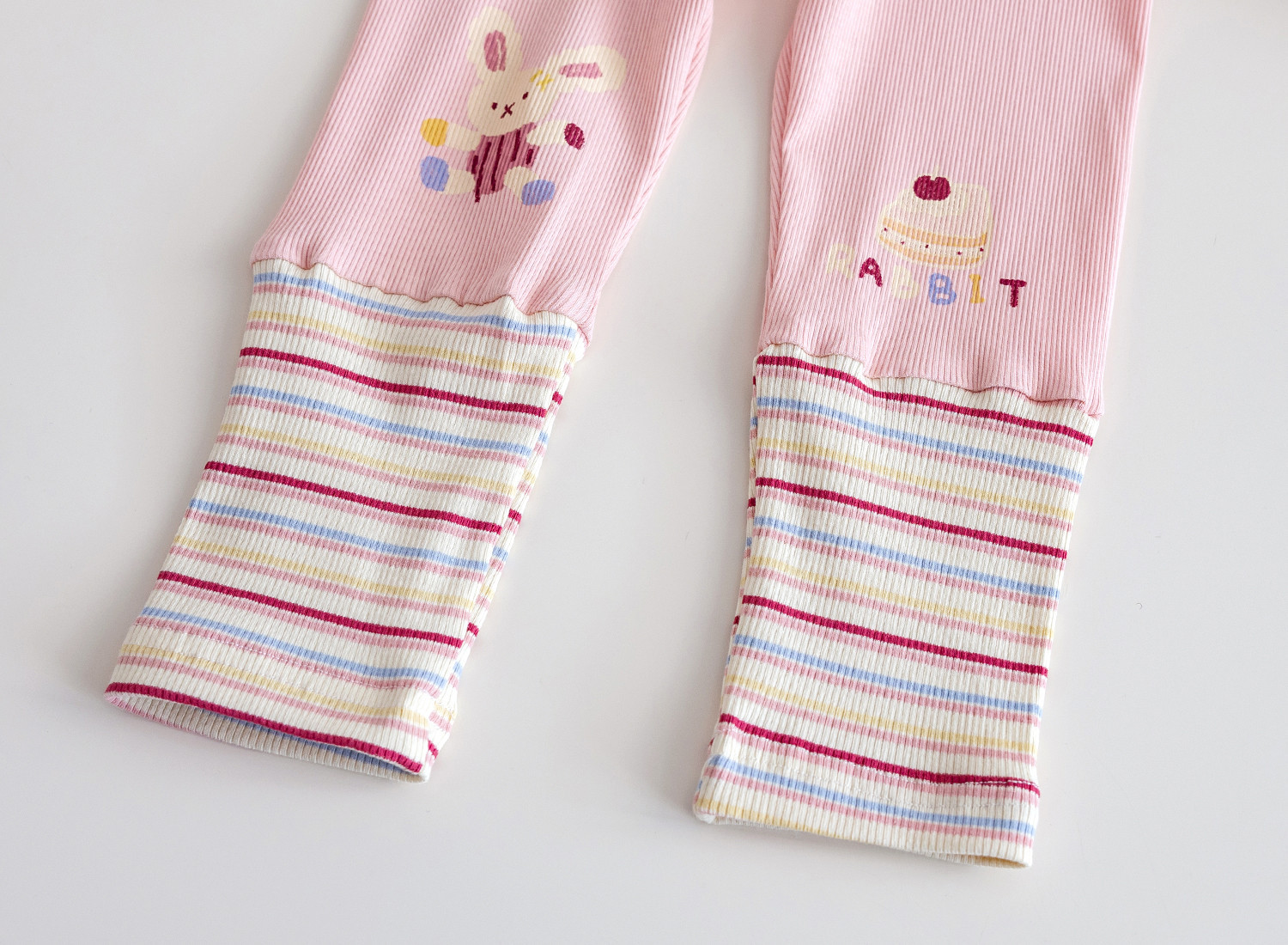 – Colanți reiați din material de calitate superioară, rezistent și elastic, în roz, cu aplicații imprimate colorate – iepuraș, brioșă și inscripția „RABBIT“, precum și dungi la baza cracilor pentru un plus de joc și veselie.