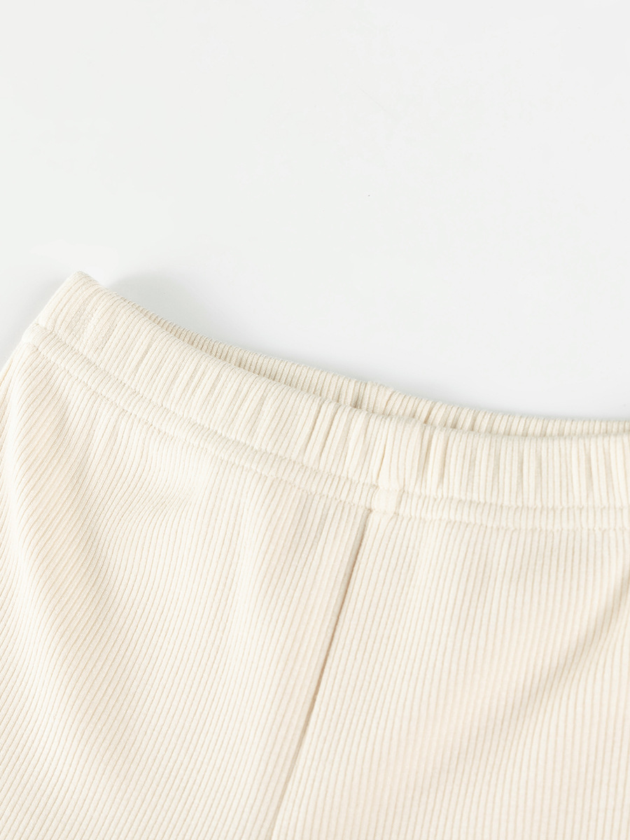– Colanți rib tip „clopot” în culoare crem deschis – cu croială ușor evazată în partea de jos și betelie elastică în talie pentru confort maxim și libertate de mișcare.