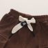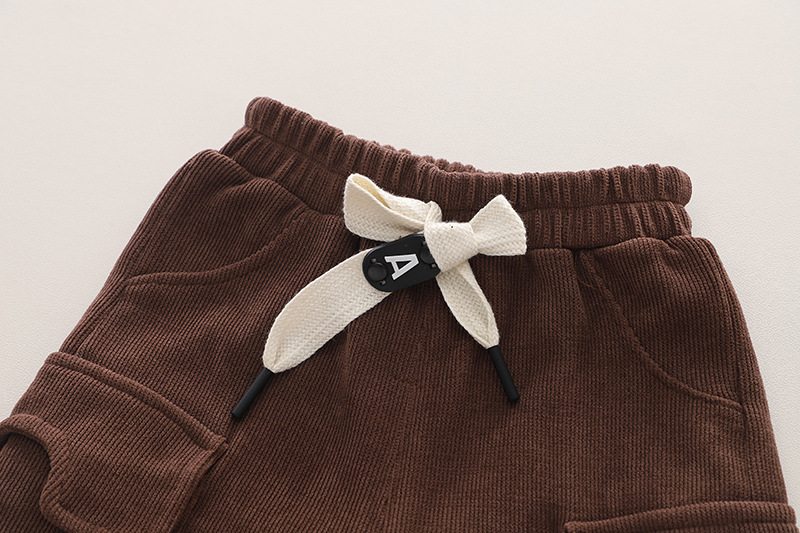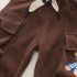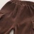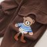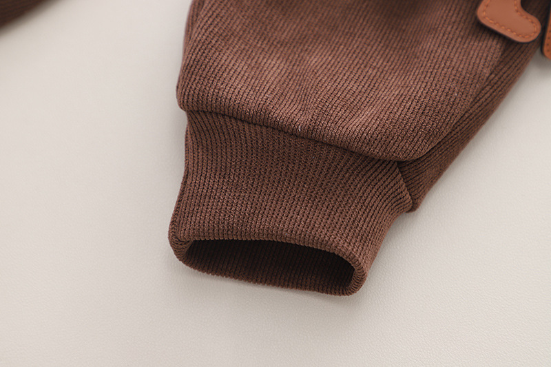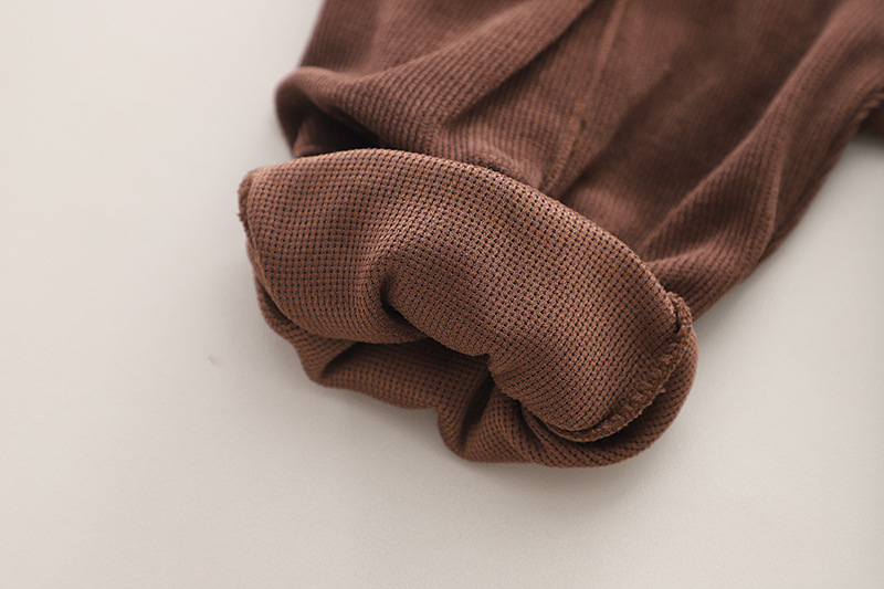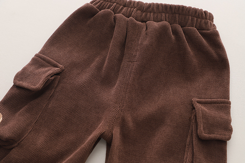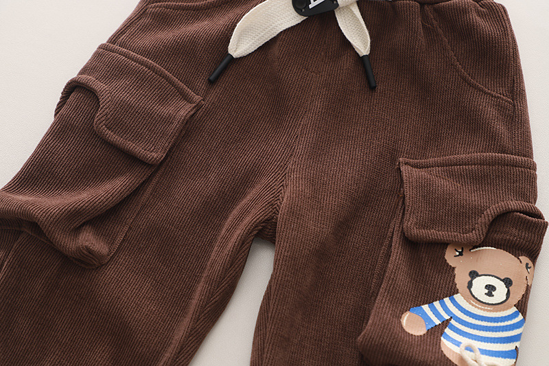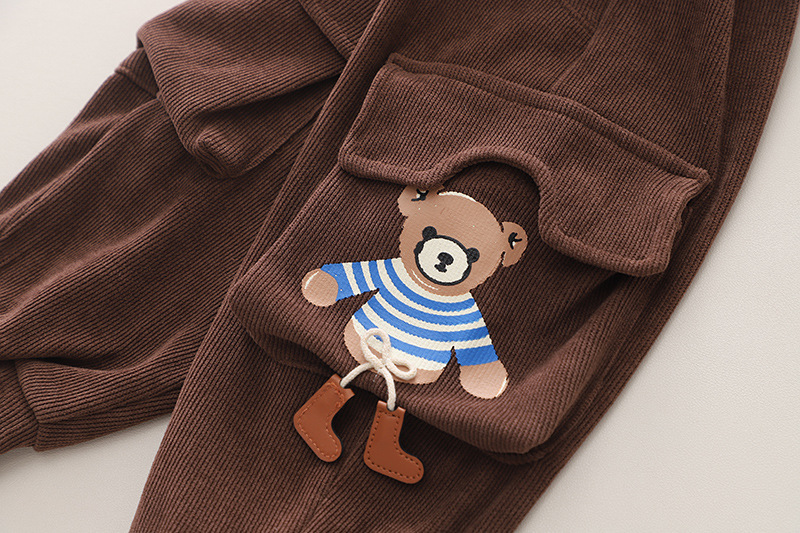 -Pantalon din denim în nuanță caldă de ciocolatiu. Talia este elastică, cu șnur decorativ și două buzunare laterale practice. Cracii se termină cu manșete elastice, iar pe unul dintre ei este adăugată o mică aplicație cu ursuleț, completând tema setului.