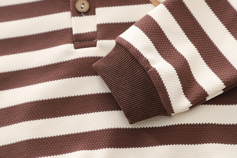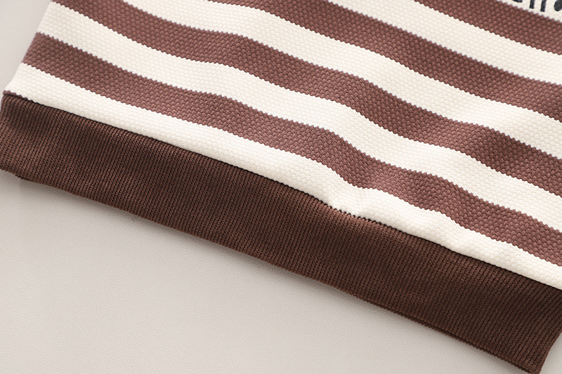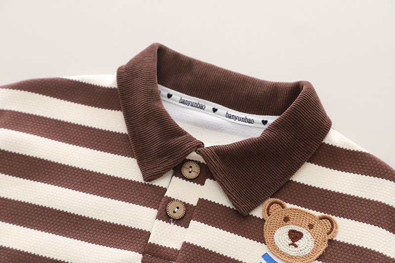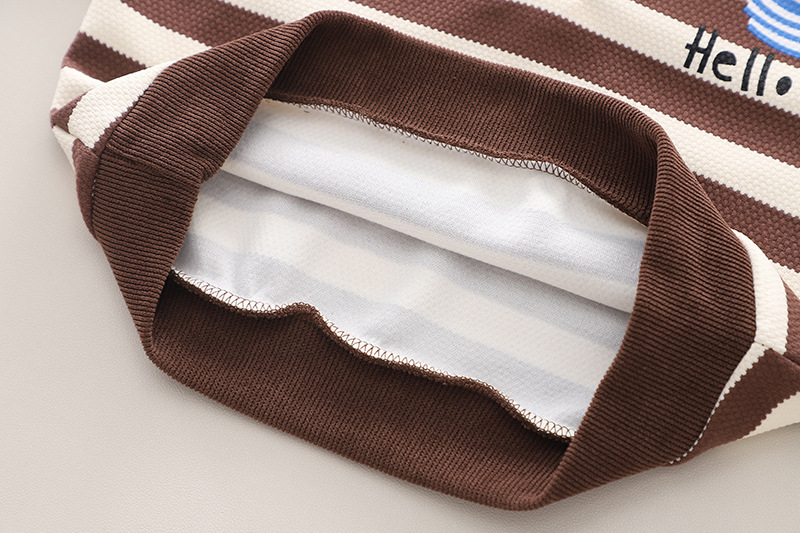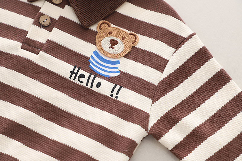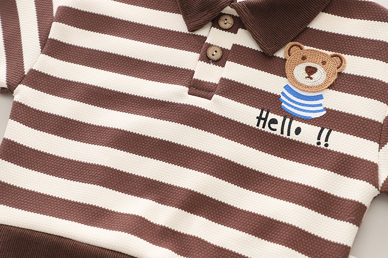 -Bluză cu guler din material texturat tip waffle de înaltă calitate, în dungi proaspete maro-alb. Modelul are un guler clasic de tip denim, care combină stilul sport cu cel elegant. Accesoriul principal este aplicația 3D cu ursuleț și inscripția “Hello!!”, ce oferă ținutei un aer vesel și copilăresc. Mânecuțele sunt prevăzute cu manșete elastice pentru confort maxim în timpul purtării.